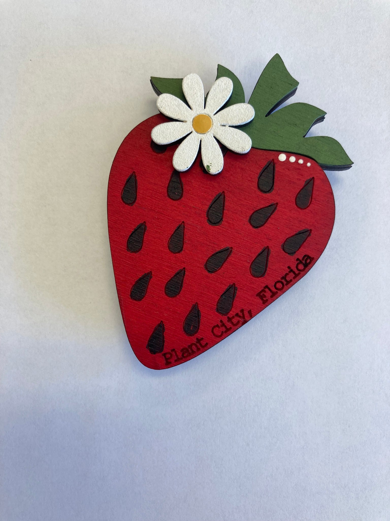 Strawberry Magnet 3” x 2” with magnet on back. An adorable magnet hand painted with a berry blossom on front.