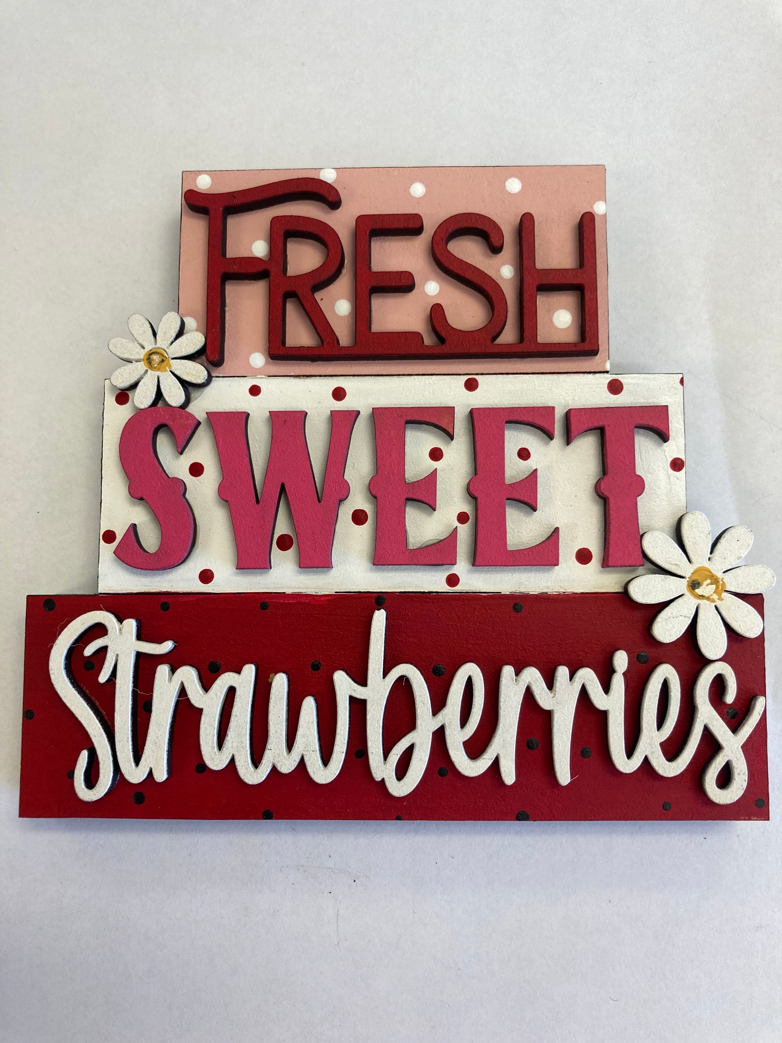 Fresh Sweet Strawberry Word Stack is a 5” by 43/4” decorative table top decor. Stacked blocks that are attached makes the cutest decor for your home.