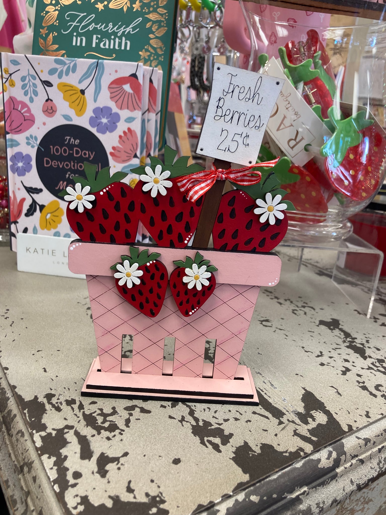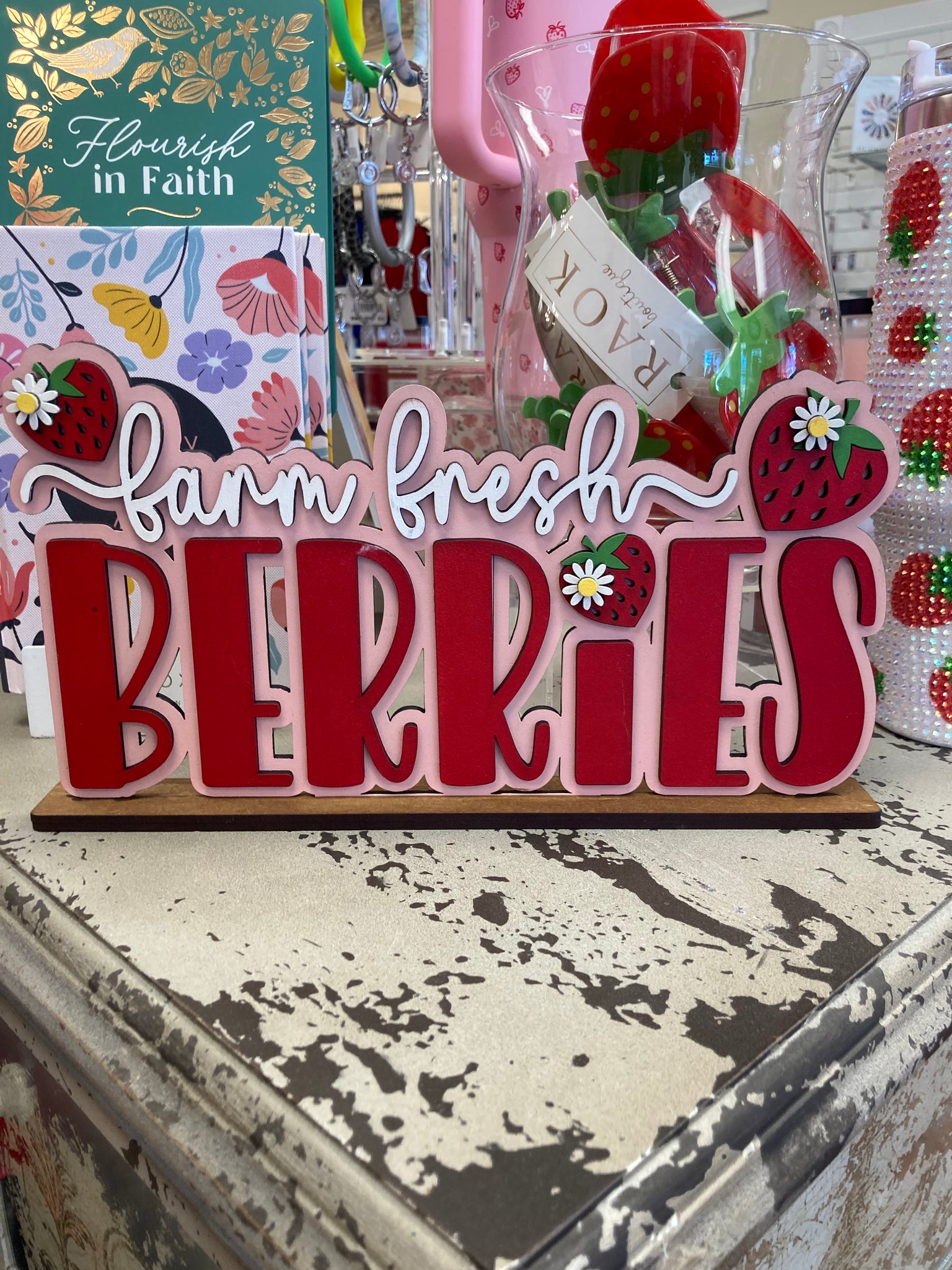 Farm Fresh Berry Stand is a table top decor with the hand painted wood cutout stating “Farm Fresh Berries” on a 11/4” stained wood stand. It is adorned with berries.