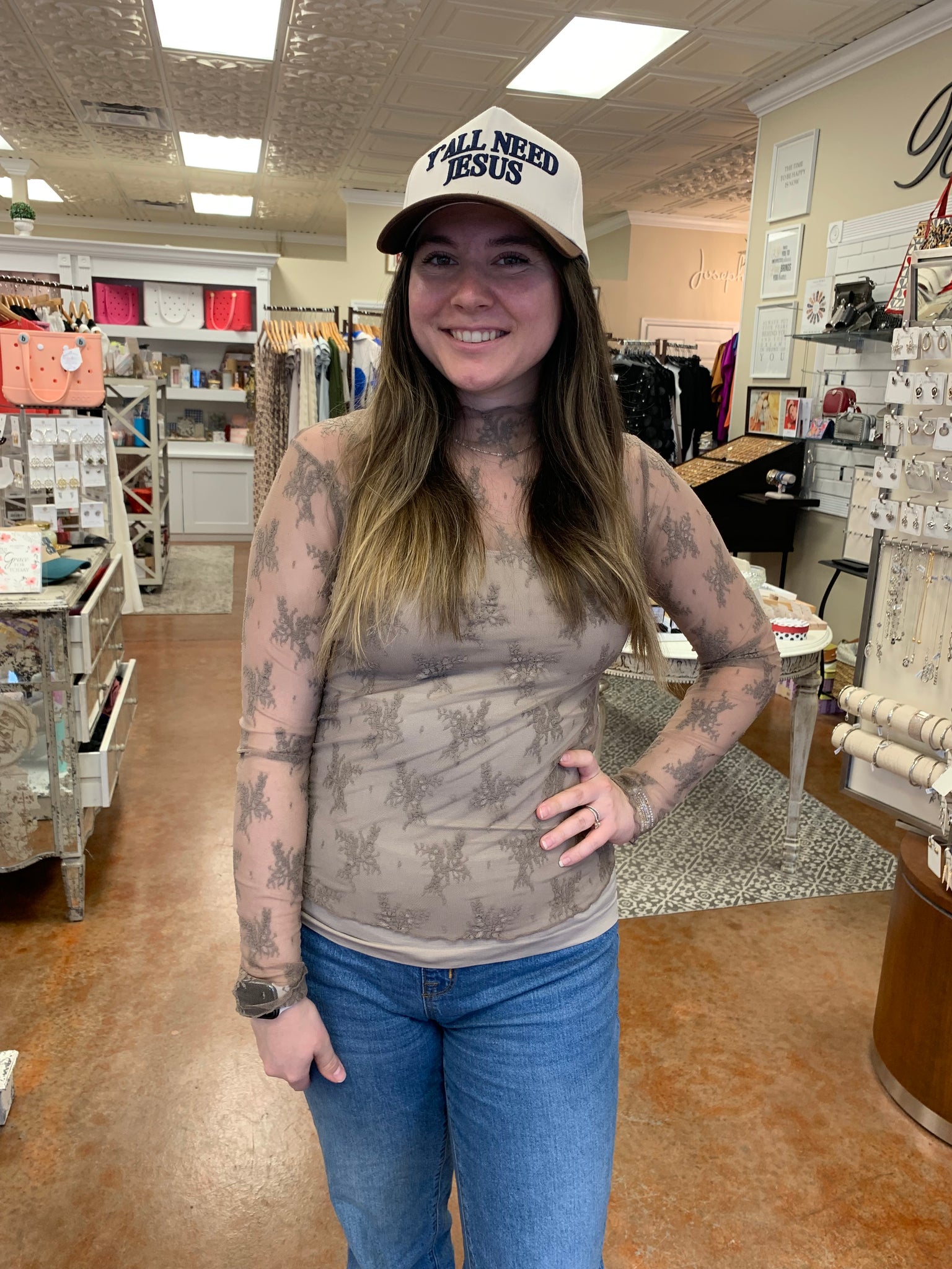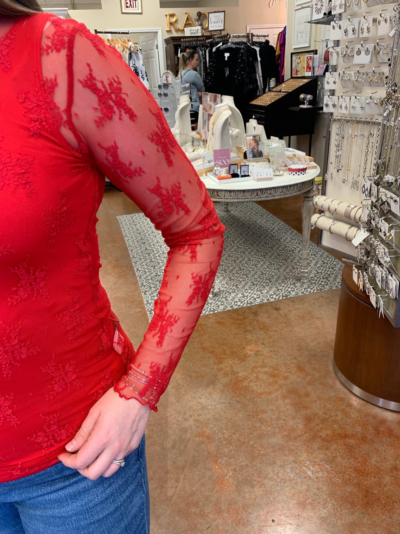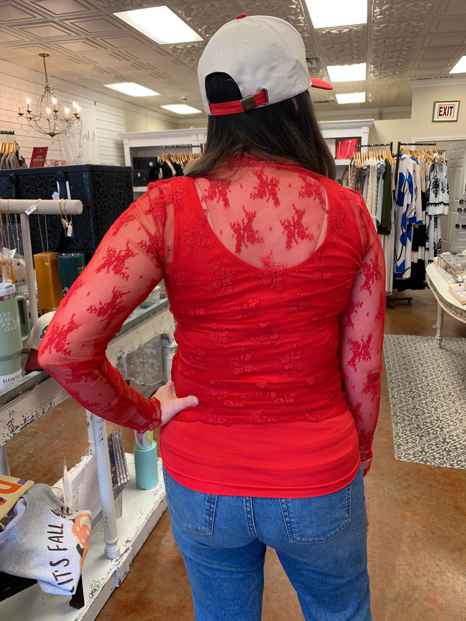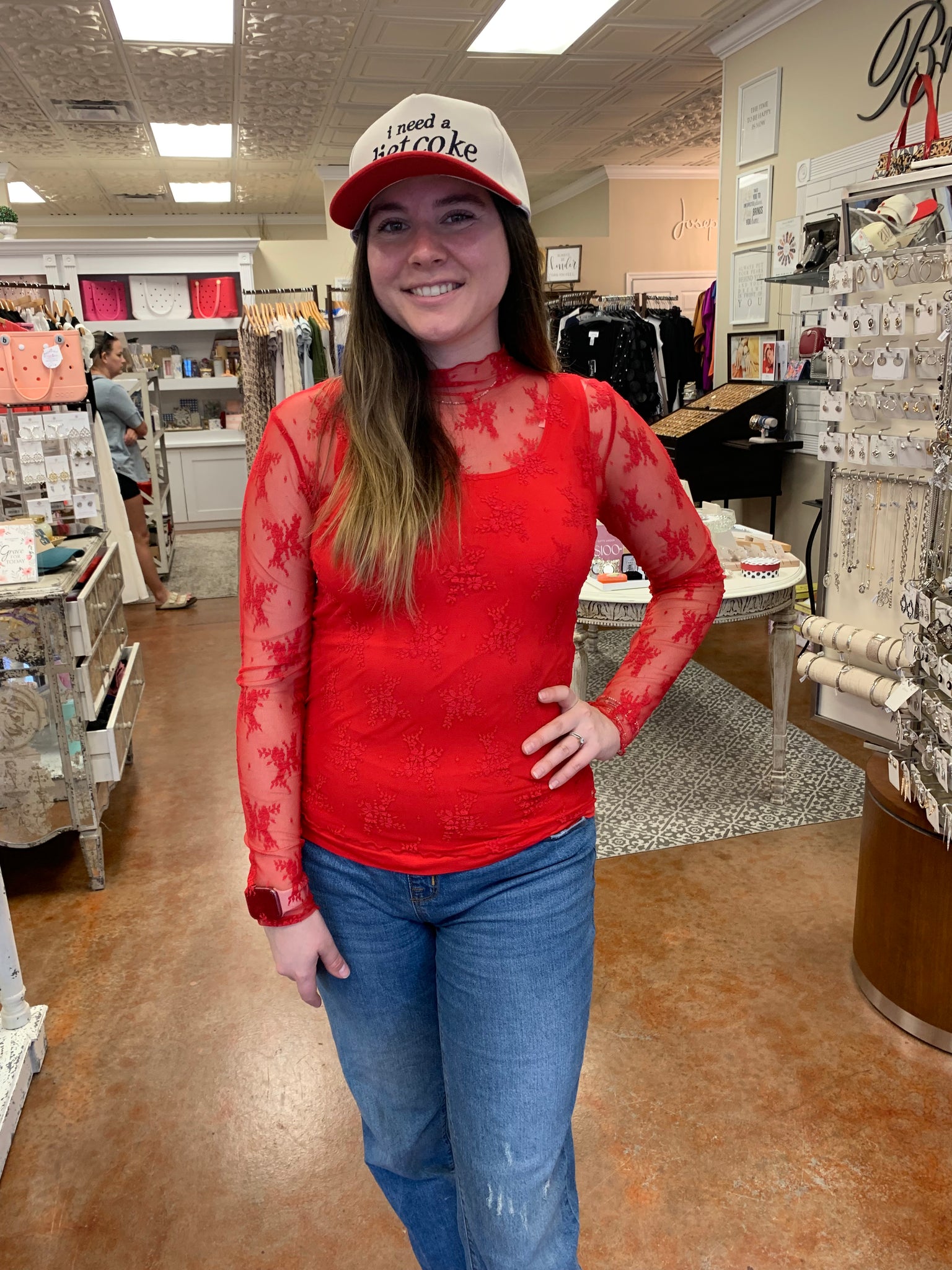 A mock neck, sheer knit top with long sleeve. Perfect for layering.