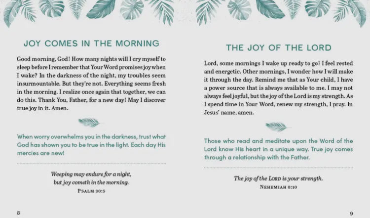 • Readings are organized by theme, including: A Joy-Filled Morning, Resting in Jesus, A Generous Heart, and True Beauty