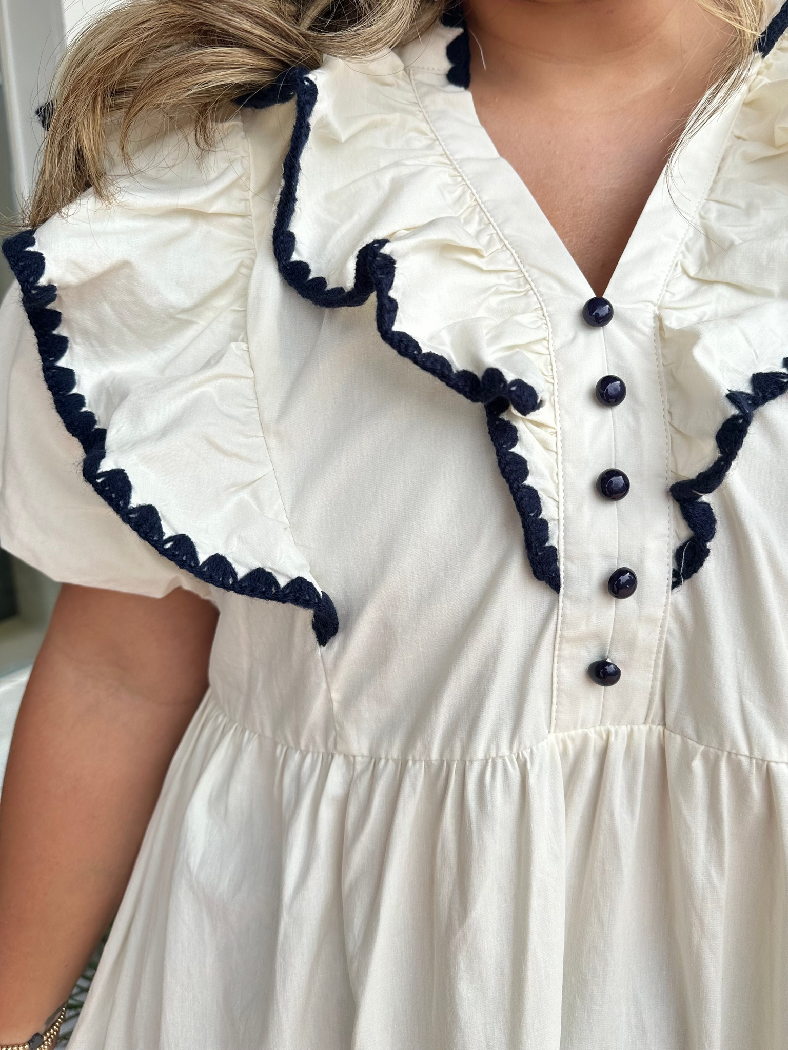 A ruffled babydoll dress with v-neckline and tiered silhouette
