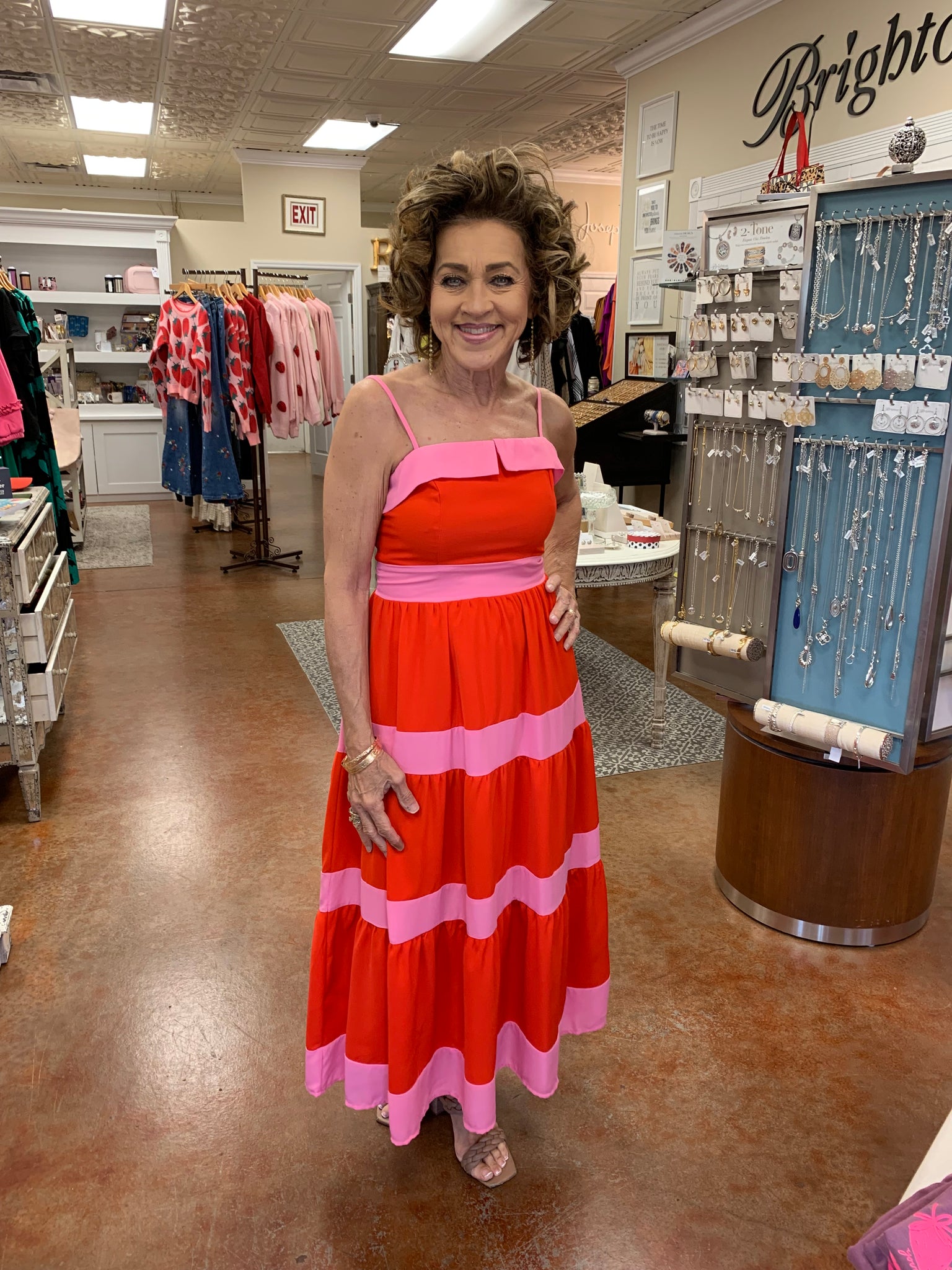 A chic tiered midi dress featuring bold alternating contrast stripes for a striking statement. Designed with adjustable straps for a customized fit, fully lined, and finished with a hidden zipper for a sleek look.