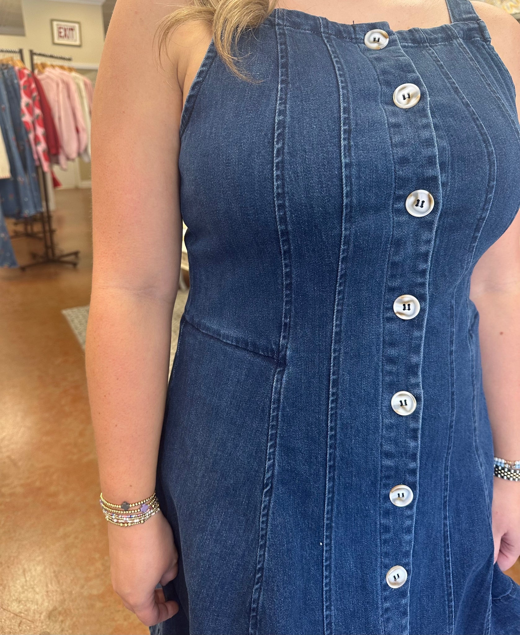 Denim dress with gold hardware buttons along the front. Square neckline and adjustable neckline.