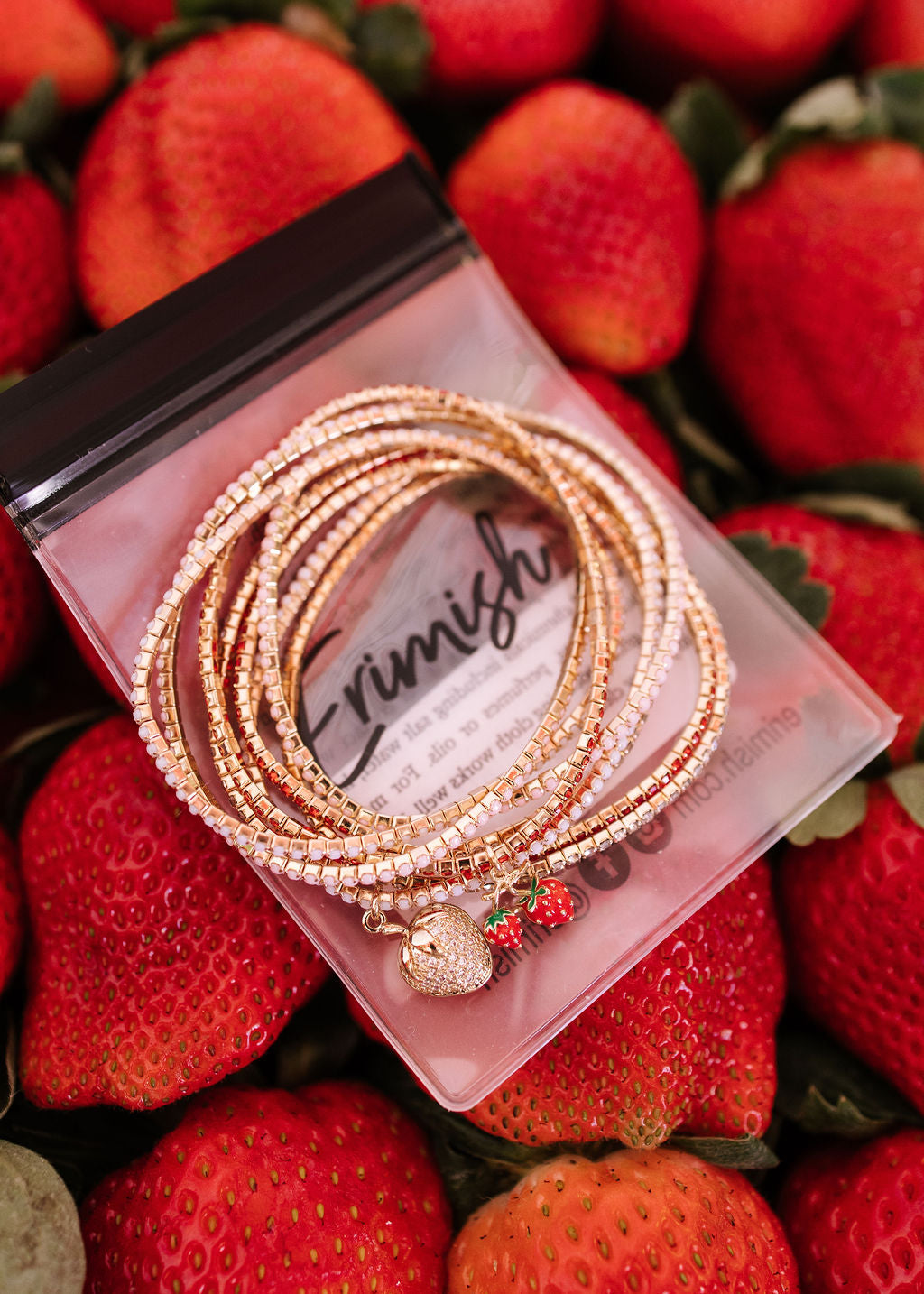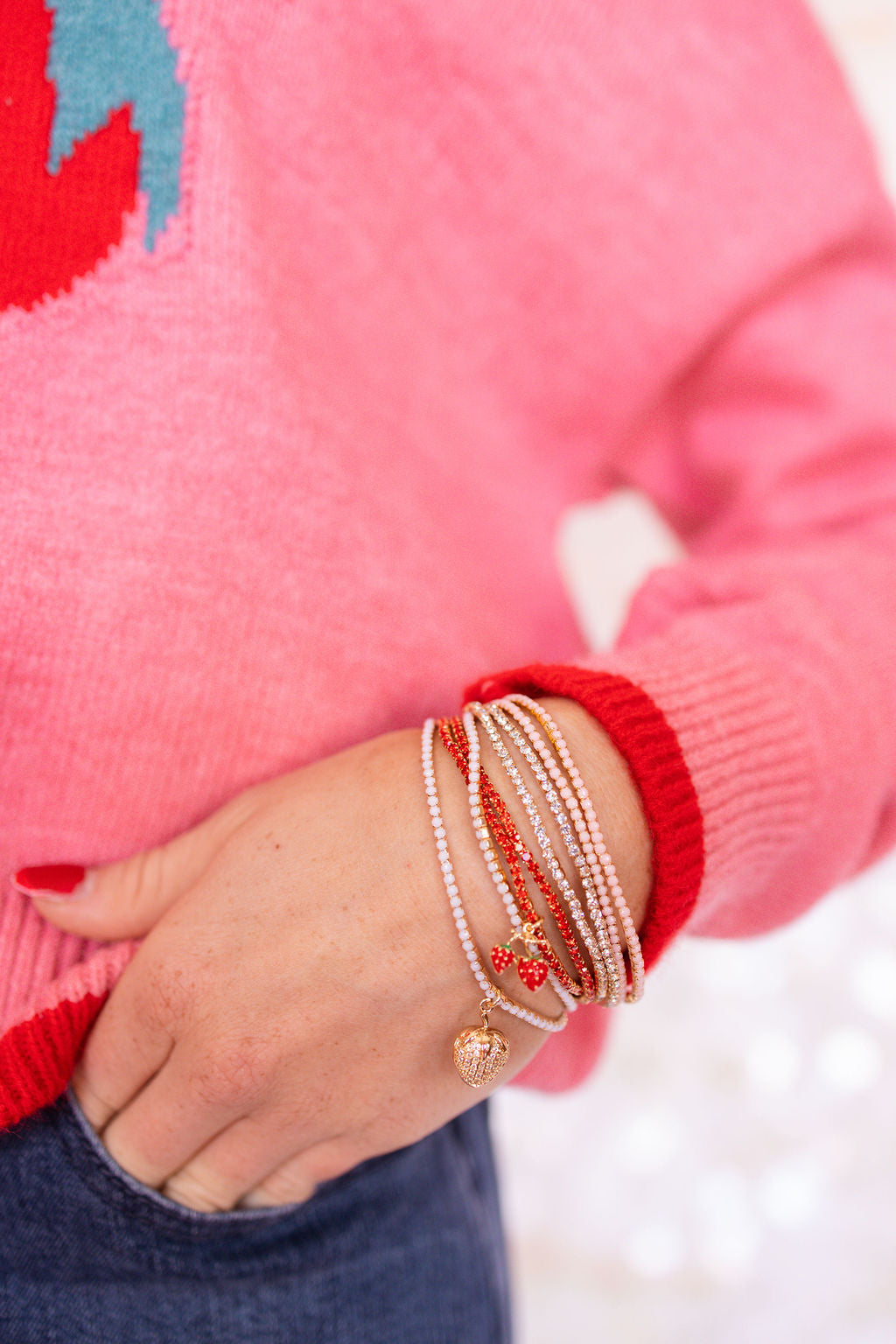 • The Strawberry Confetti Stack adds a touch of luxury to your wardrobe.  This sparkling stretch bracelet stack that comes in pinks reds, white and clear accented with strawberry charms is both subtle and full of sparkle, adding  fun color to any ensemble. Elevate your style with this exclusive, elegant accessory.