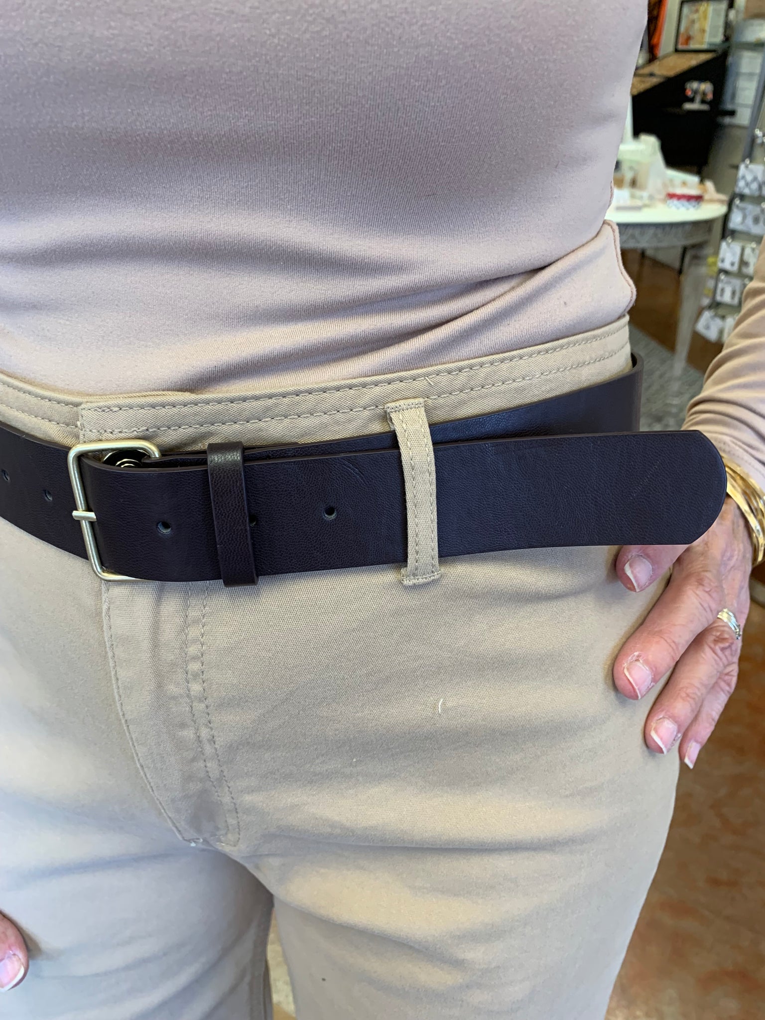 Relaxed-leg stretch twill pants featuring a matching wide belt with floor-length hem