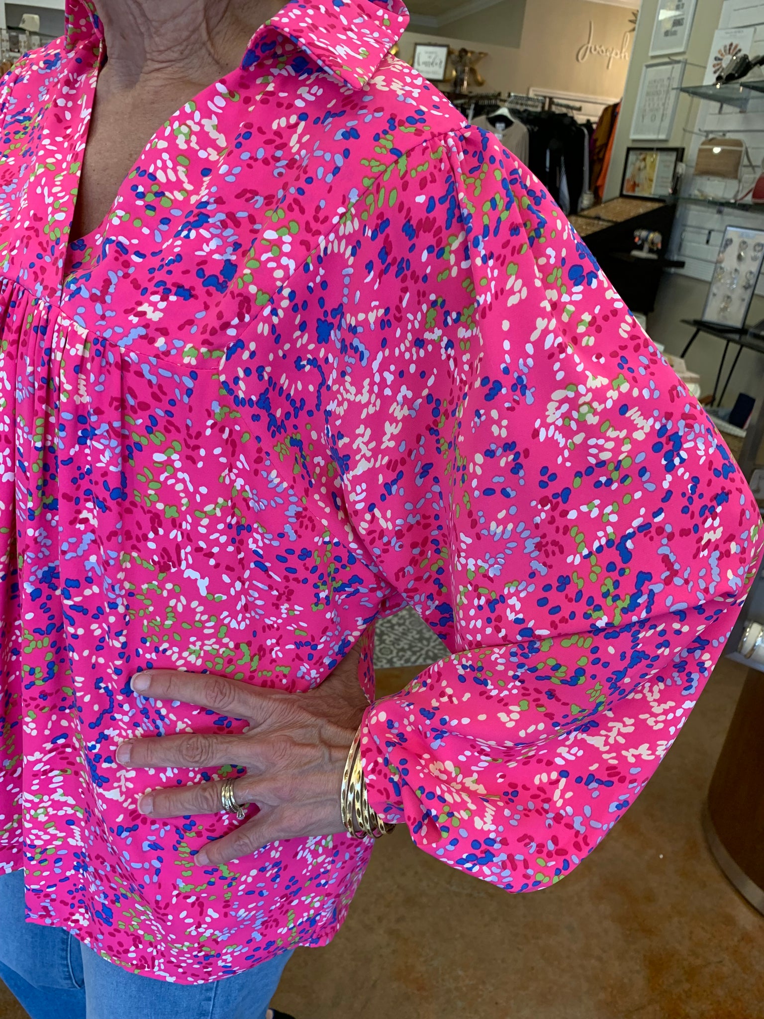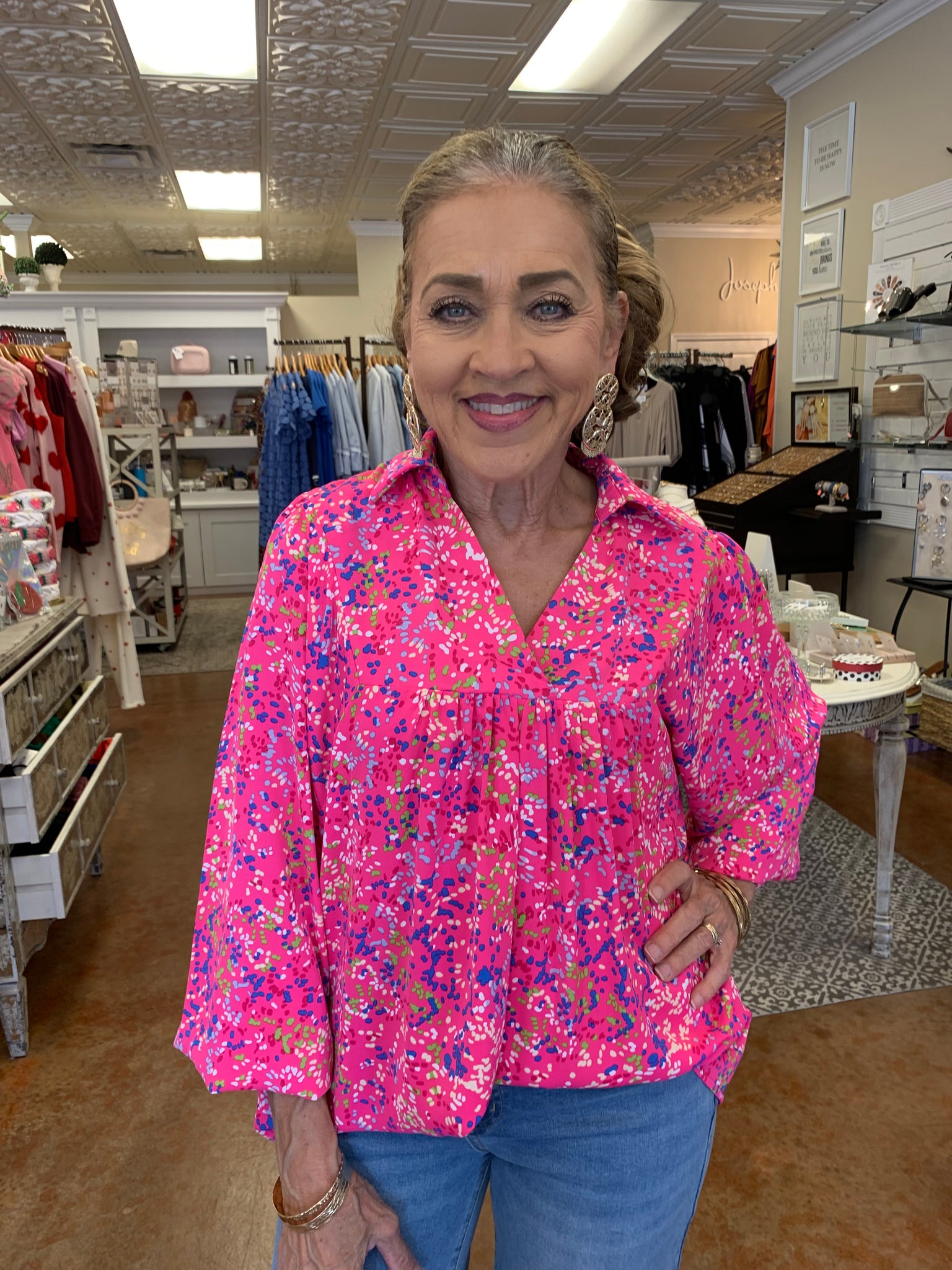 • This women’s blouse features a stylish abstract print. • Flattering babydoll silhouette for a feminine touch. • Collared V-neck adds a sophisticated flair. • The loose fit style is suitable for different shapes.