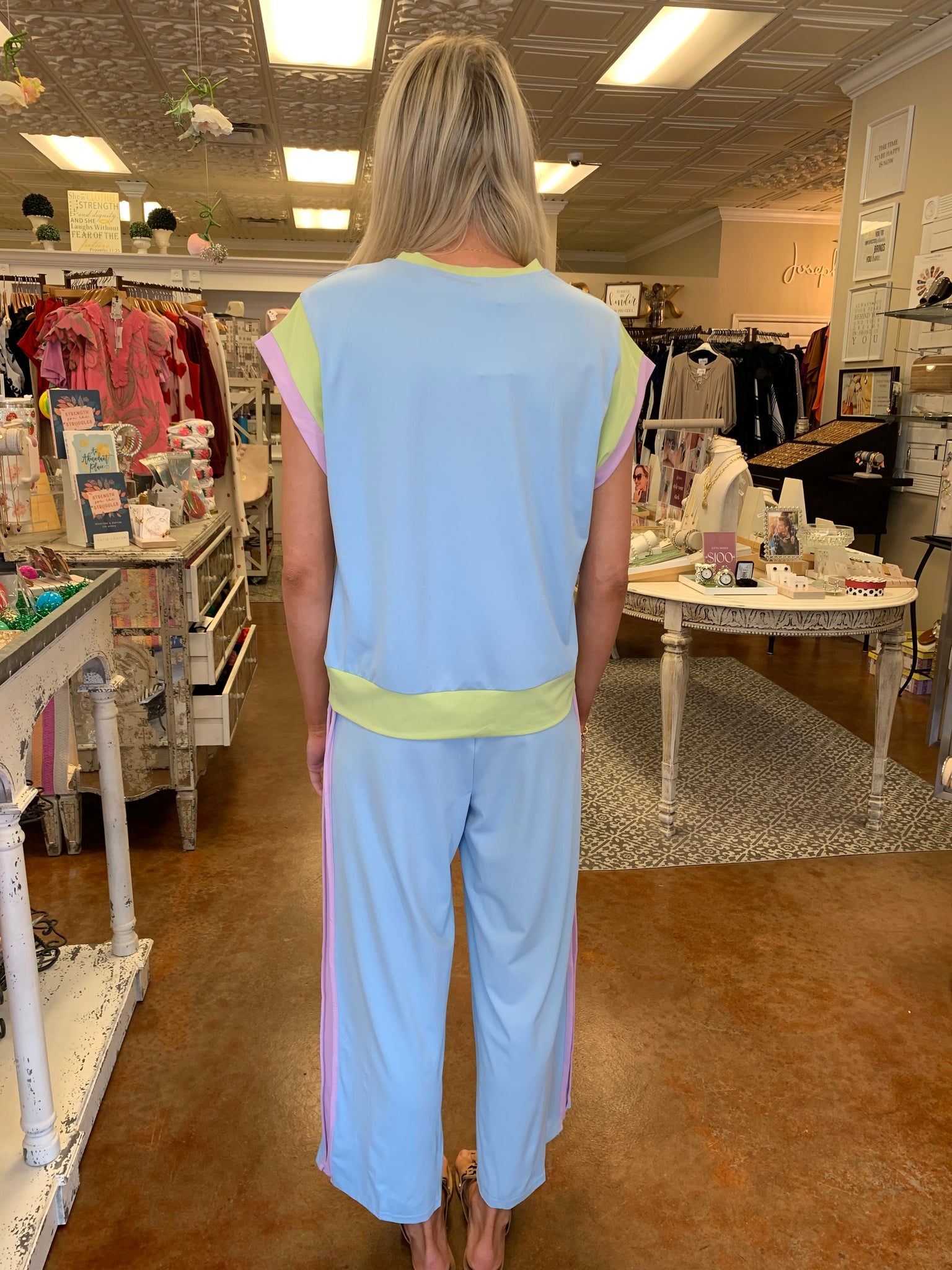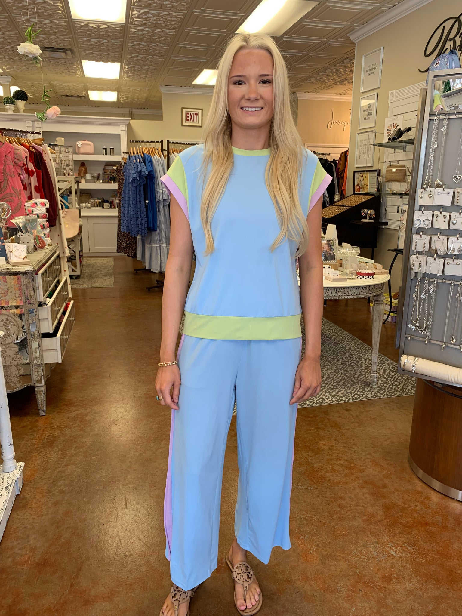 Color block two-piece lounge set featuring a cap sleeve tee and cropped wide-leg pants