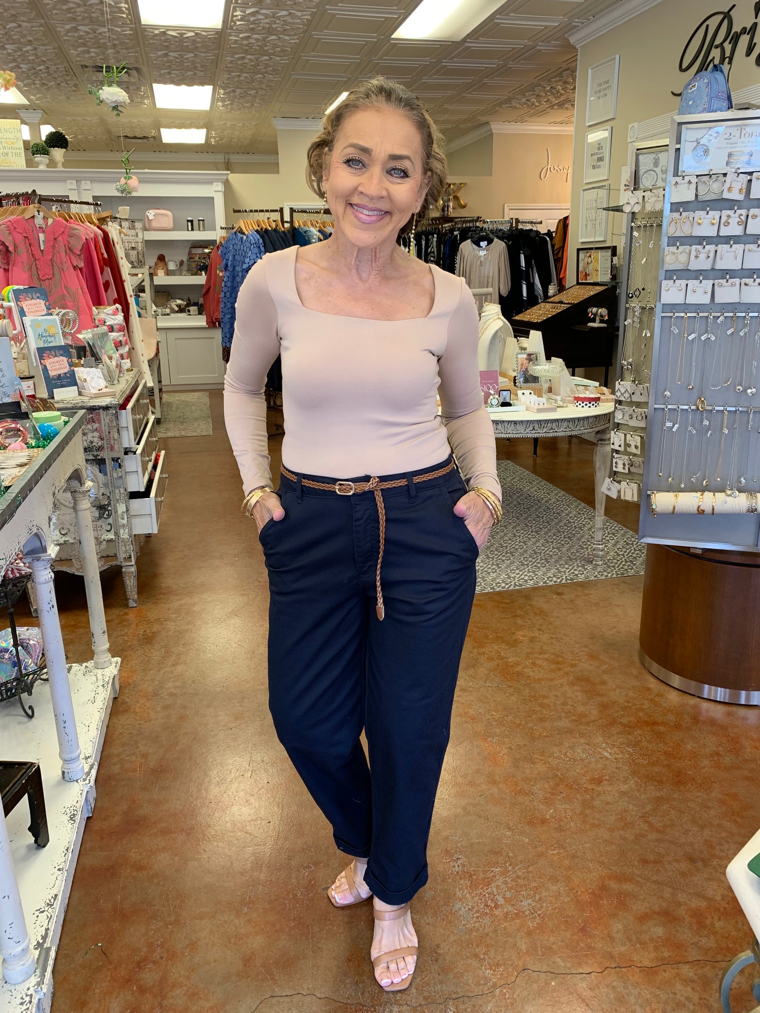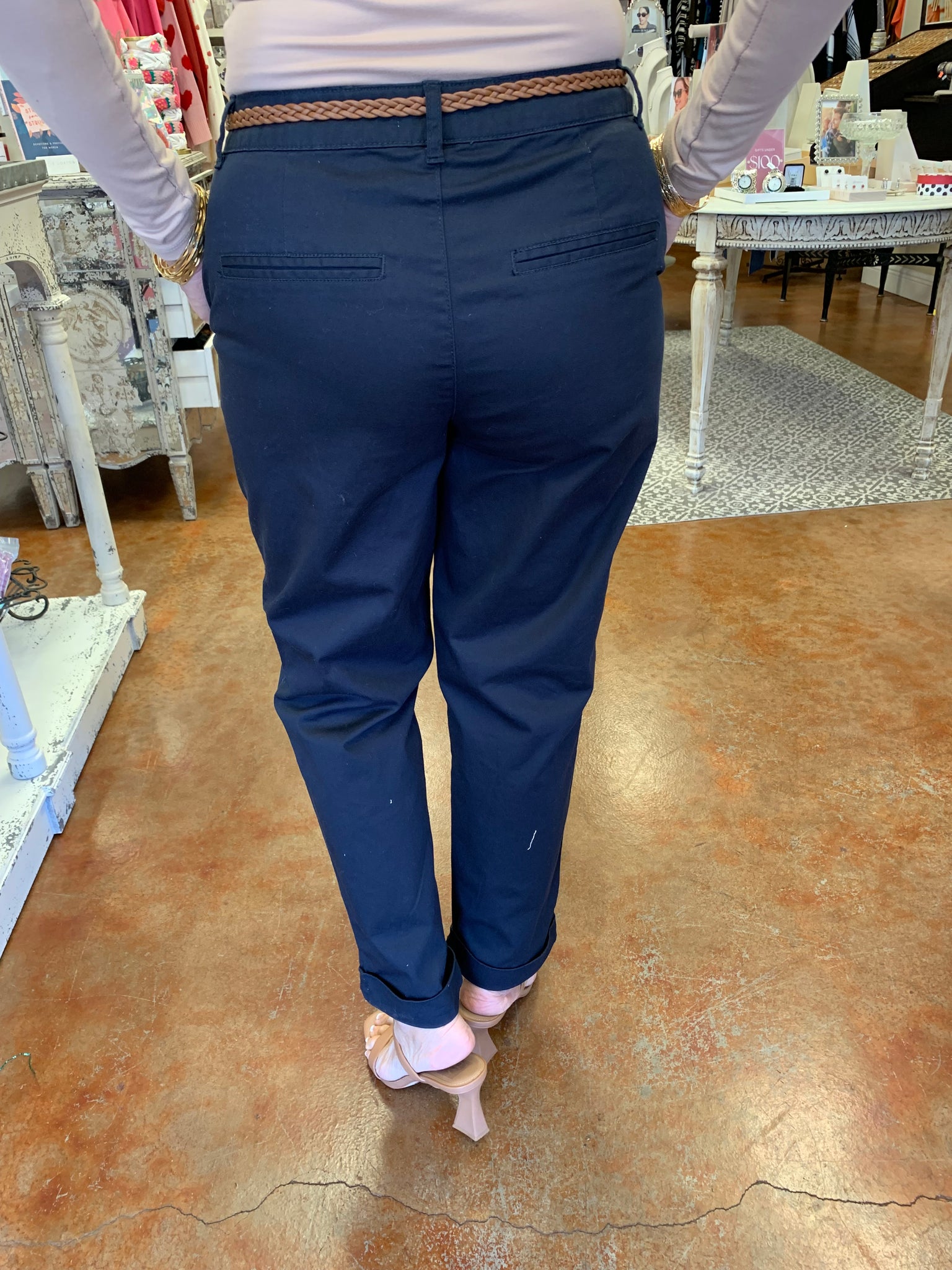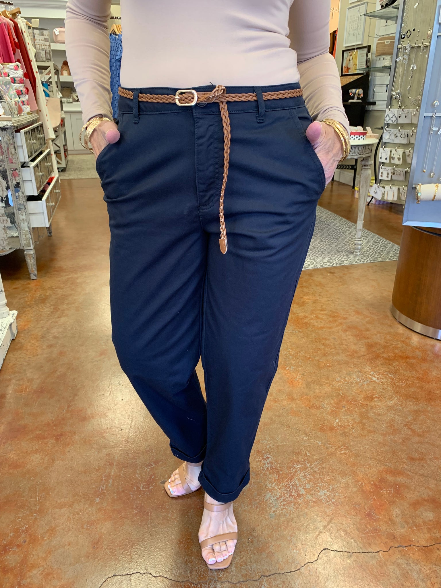 Stretch cotton twill chino pants with a boyfriend fit and included braided belt