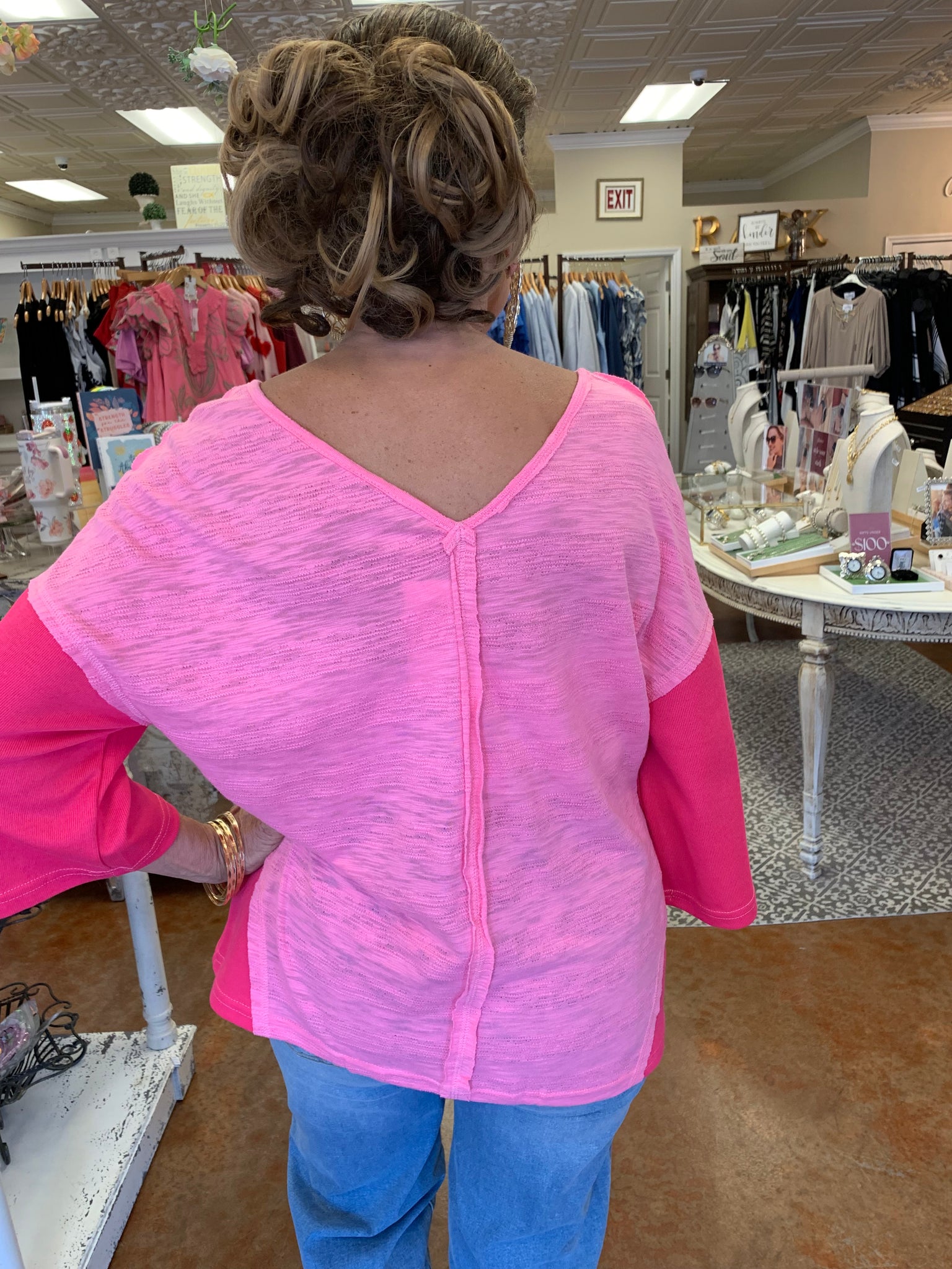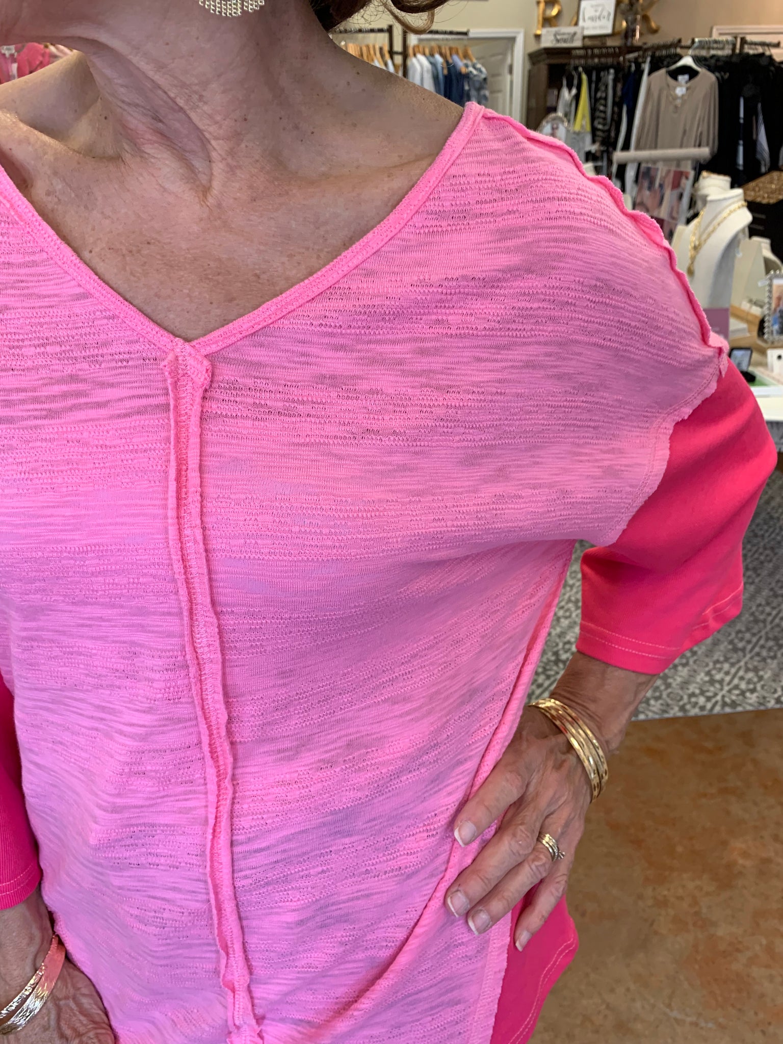 Loose V-neck blouse with contrast patchwork detailing and 3/4 sleeves