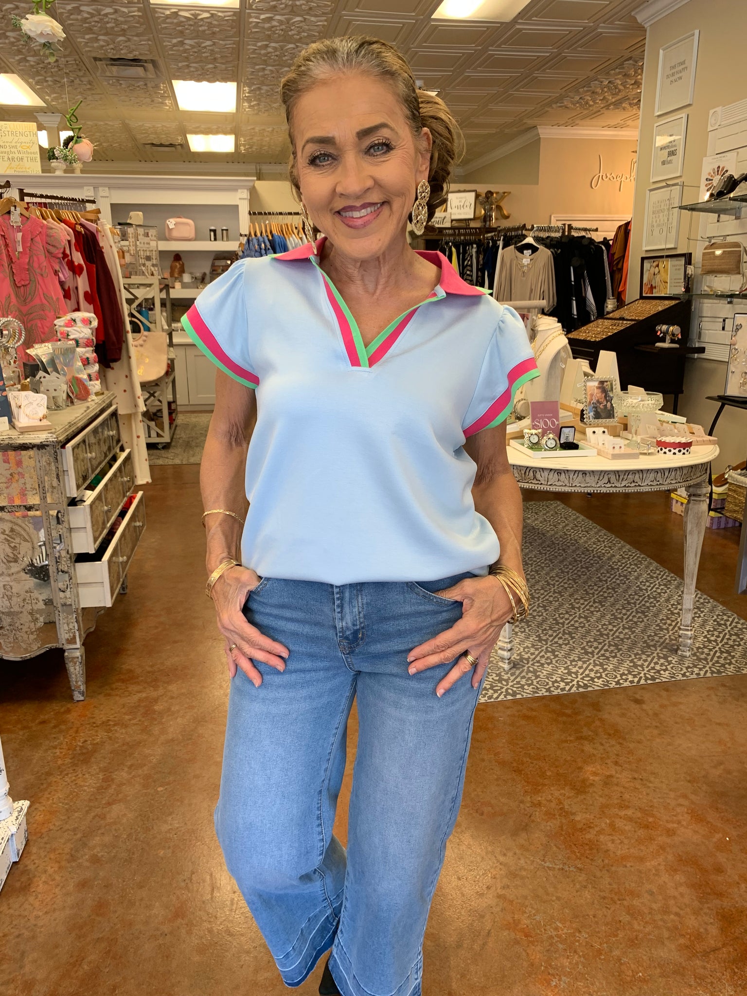 - The contrast striped trim adds a fun pop of color to this summer blouse. This top for women is graceful with ruffled sleeves. The collared v neck is elegant and feminine. Stretchy, soft and comfy with quality made.
