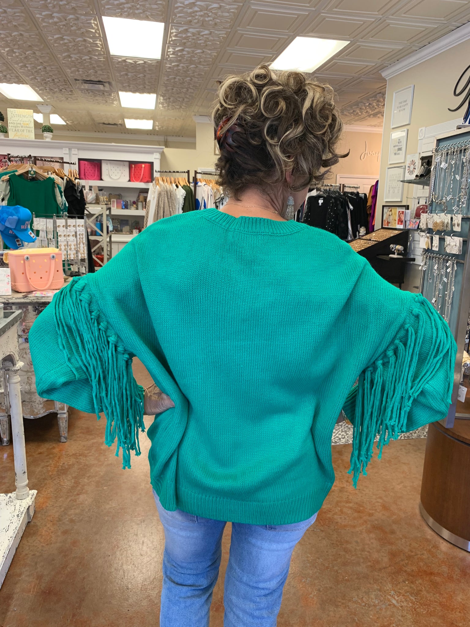 A fun pullover light weight sweater featuring crew neck, drop seam shoulders and fun fringe at the top of the sleeves.