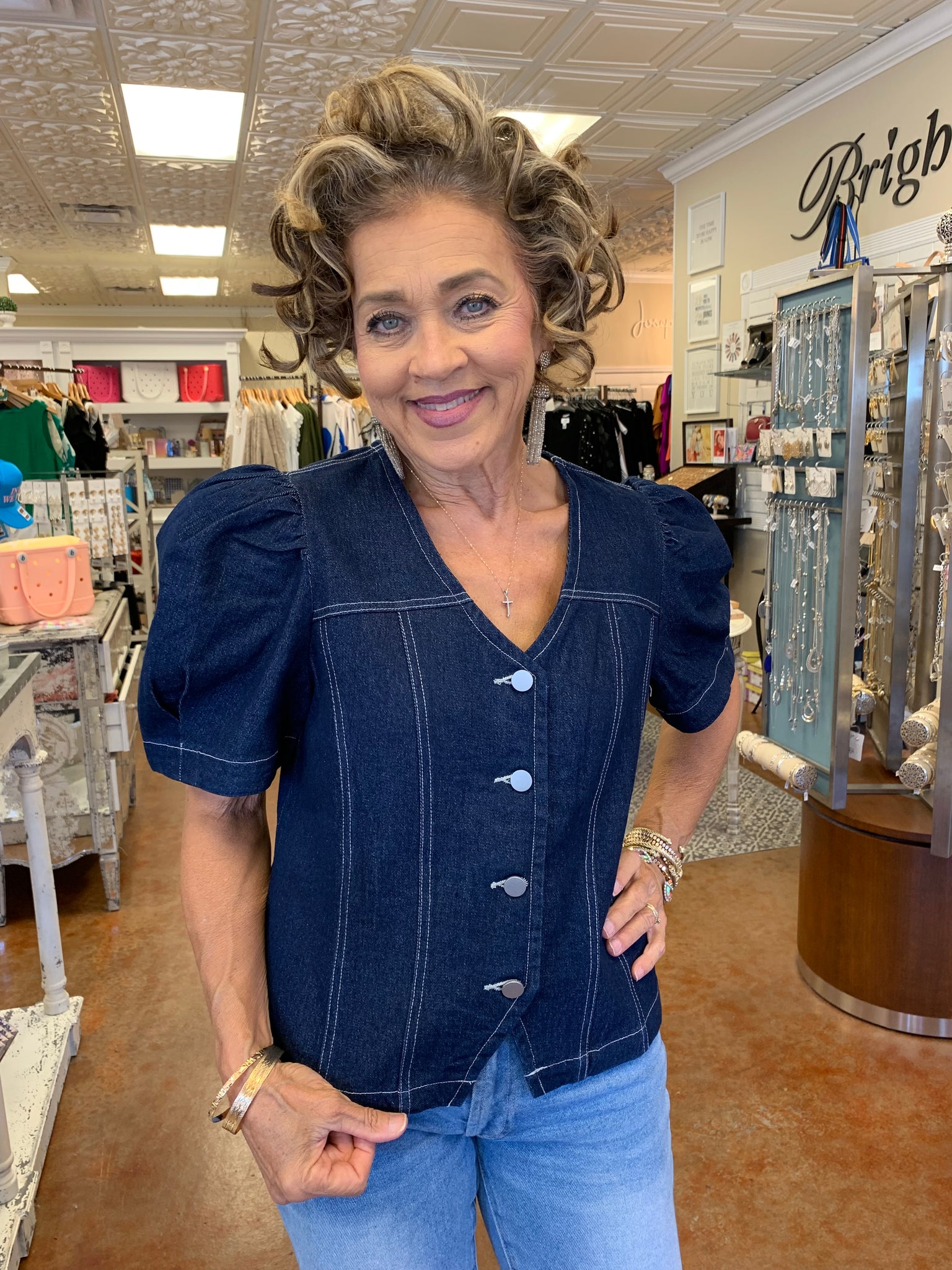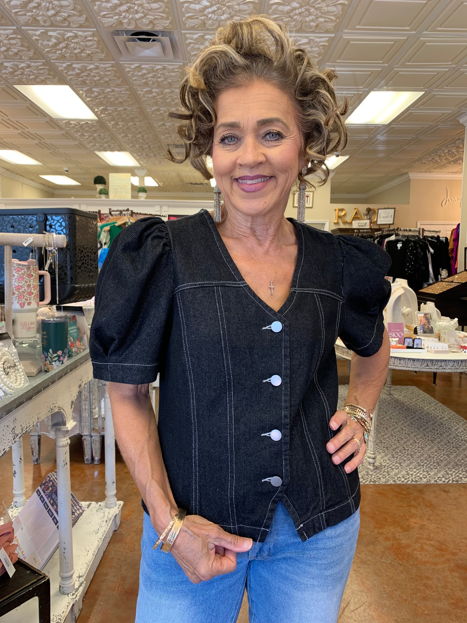 A v-neckline denim button down top with puff half sleeve, not lined.