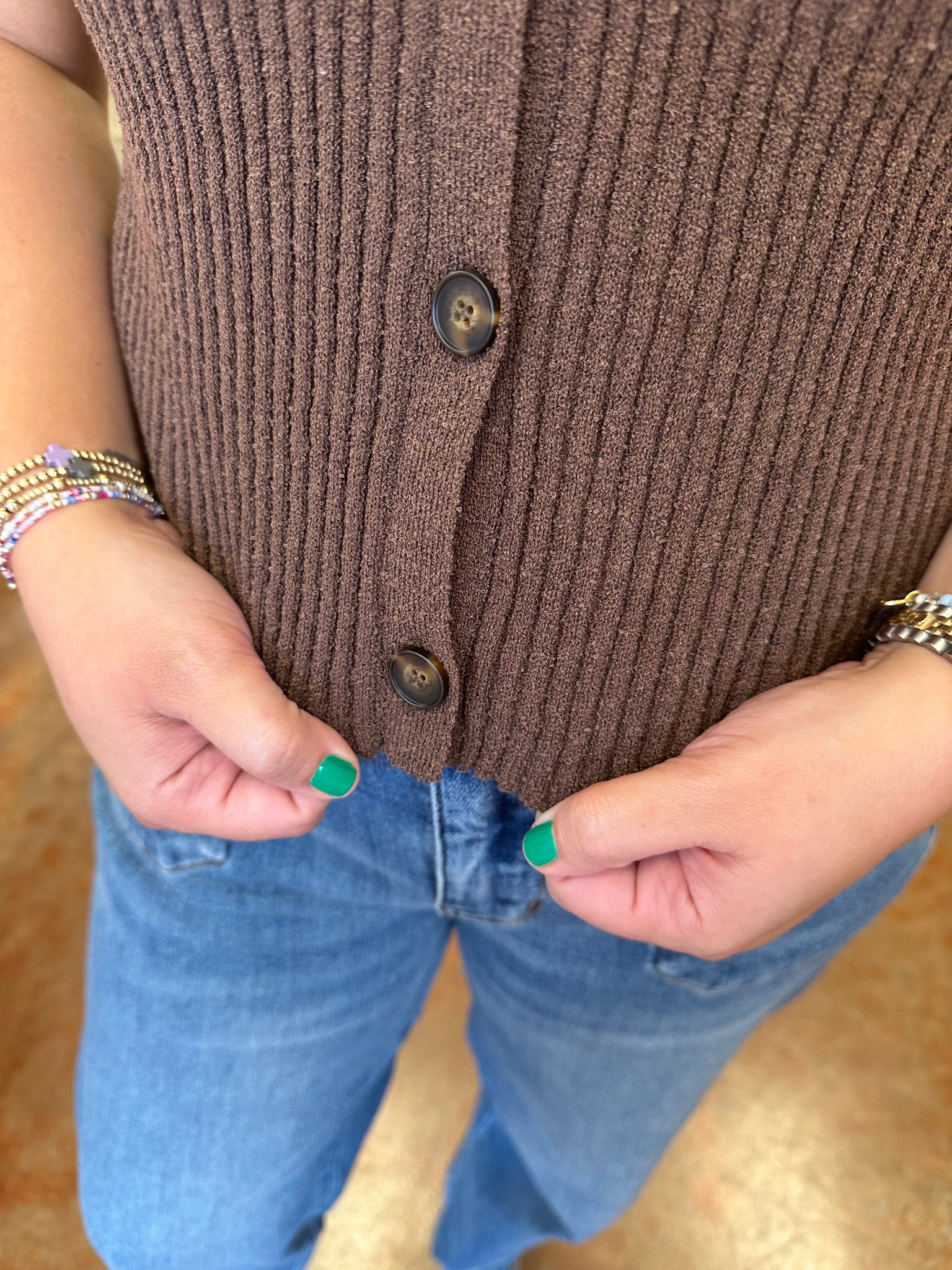 A ribbed sleeveless sweater vest with functional buttons along front.