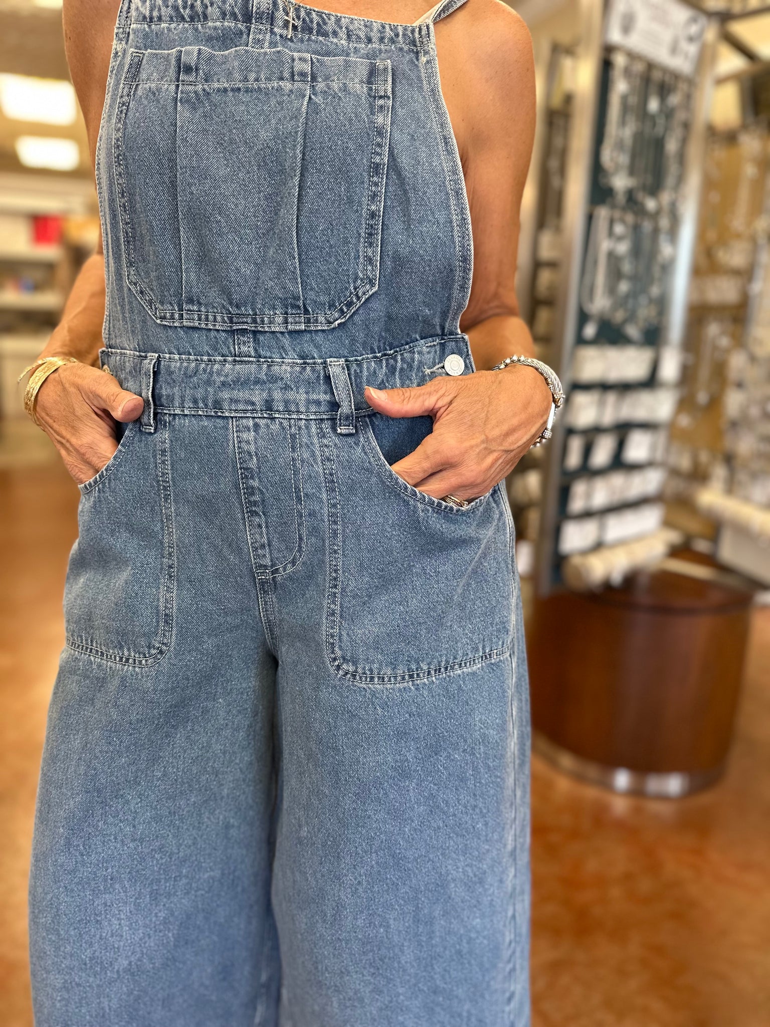 A denim washed, wide leg overalls with adjustable straps at back.CONTENT + CARE: