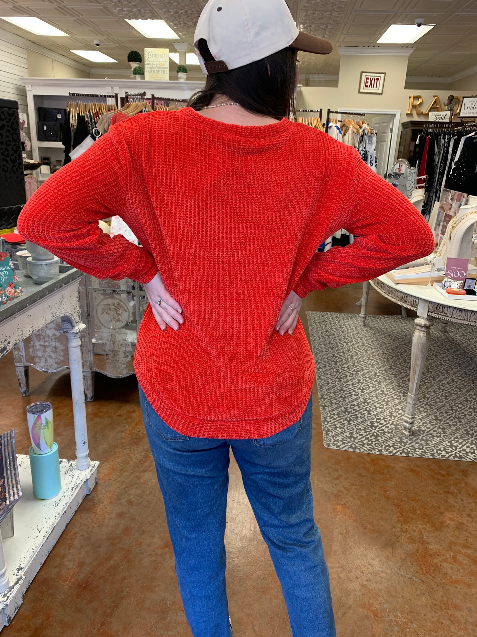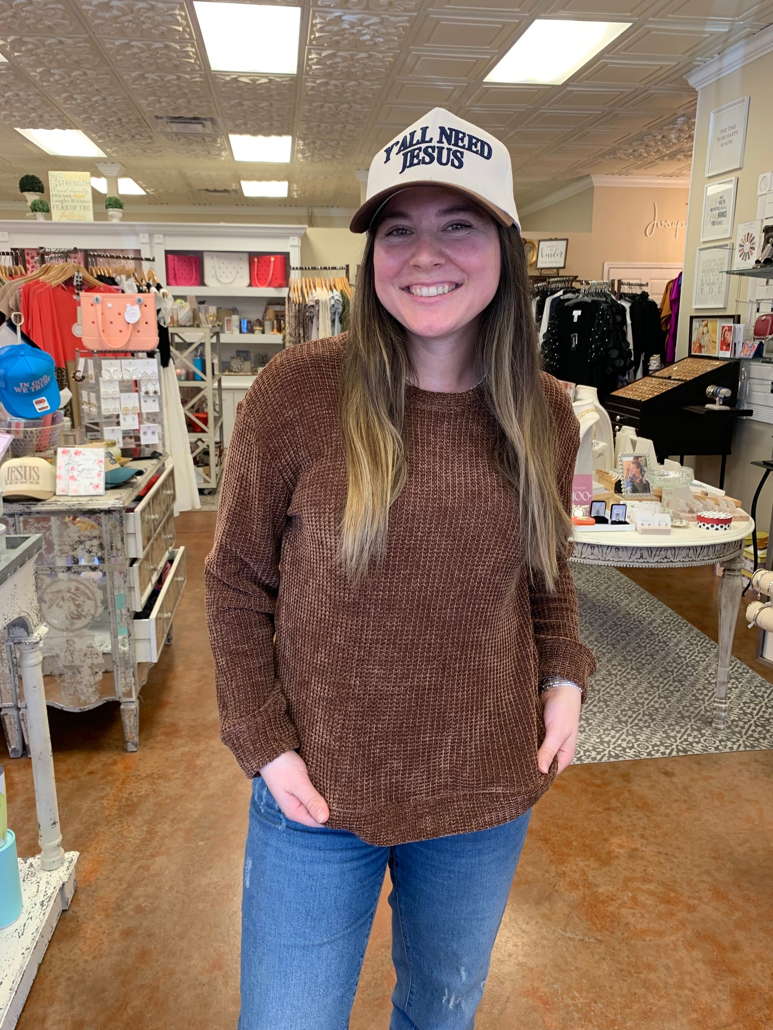 A chenille waffle knit sweater with round neck, relaxed fit.