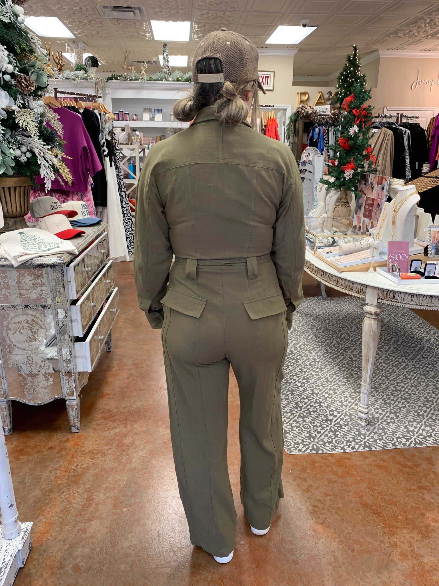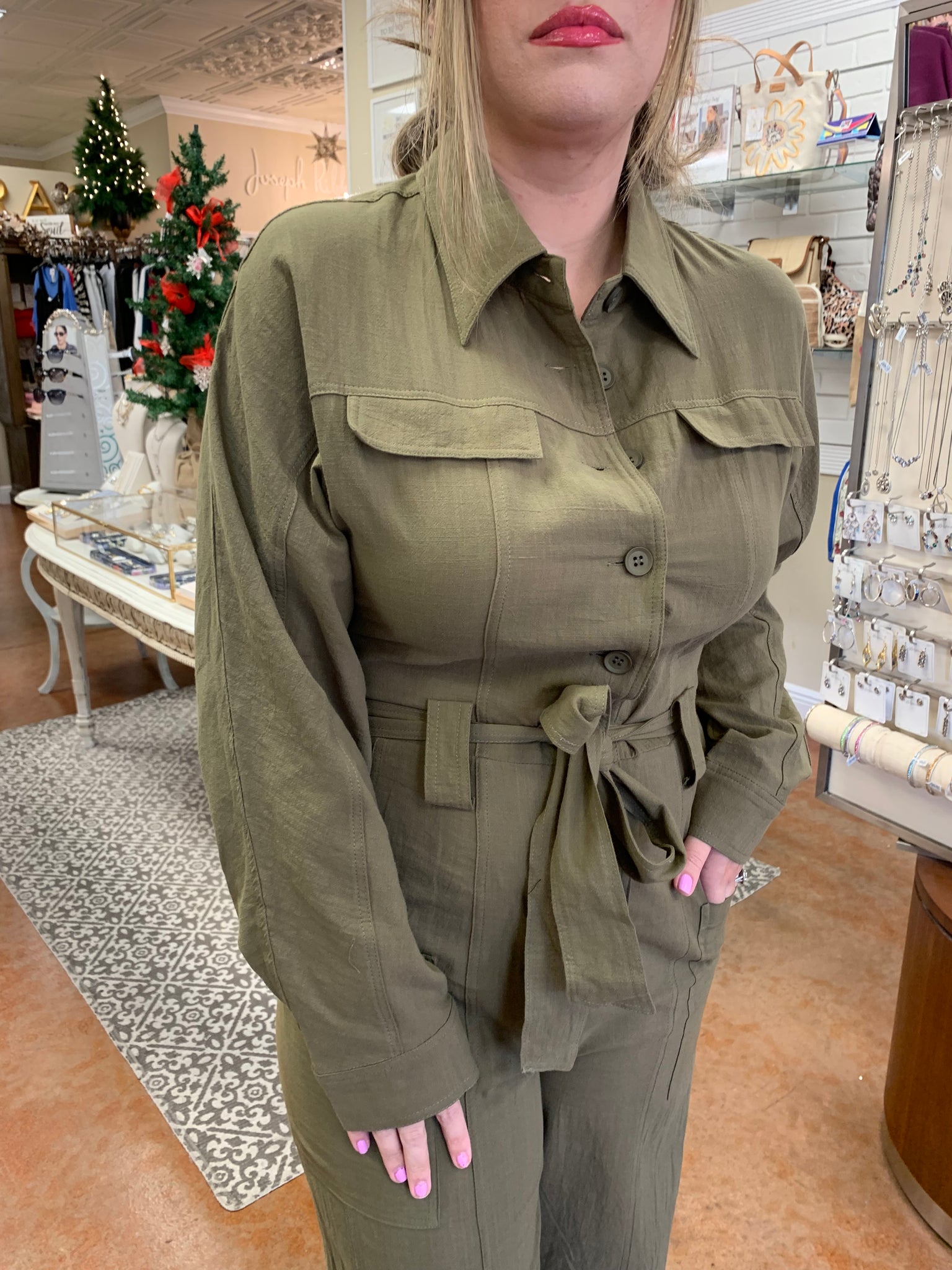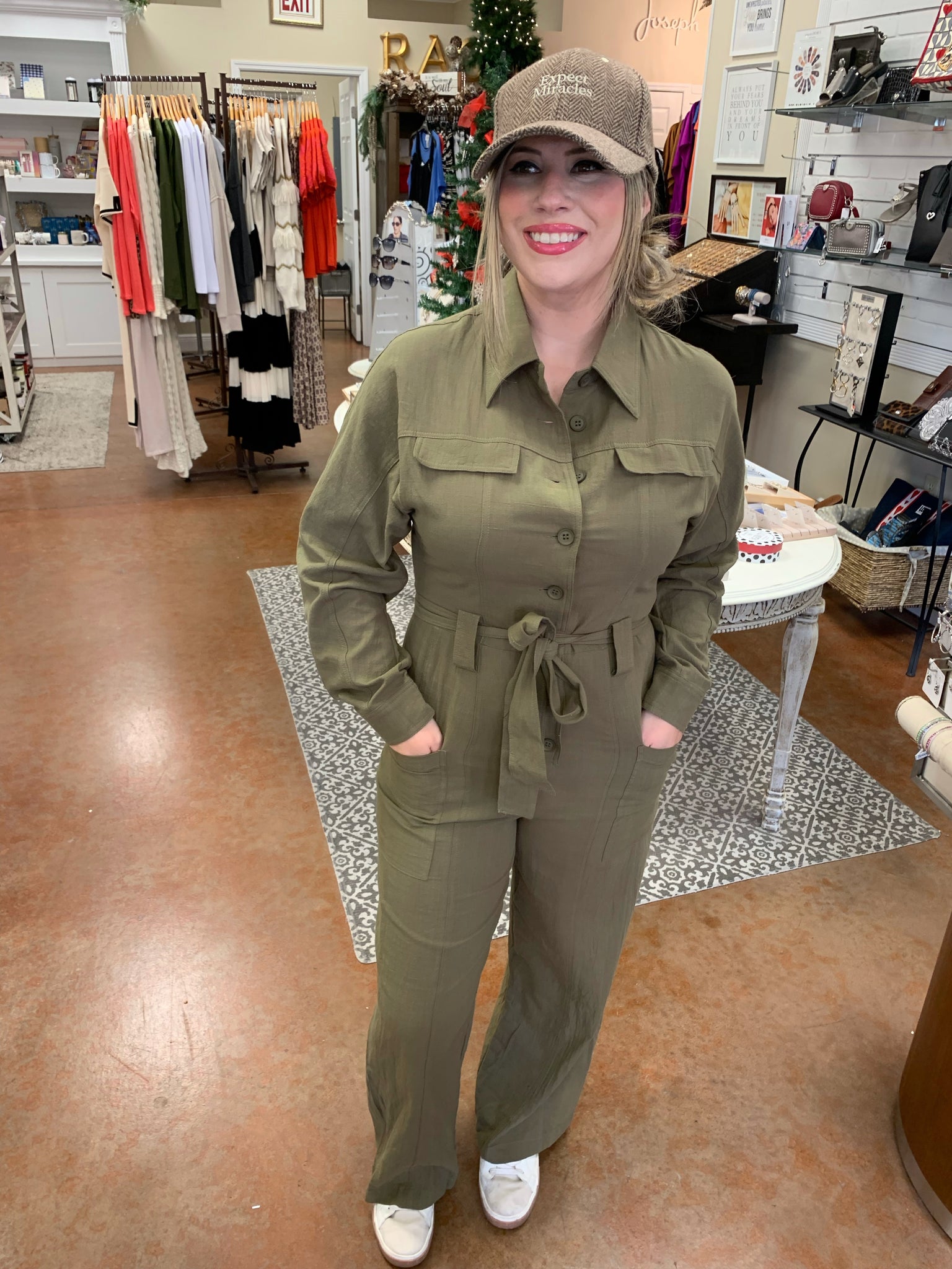 The button-down tie-waist shirt jumpsuit combines chicness with ease. With its button-down design and a flattering tie-waist feature, it offers a stylish and comfortable fit. This jumpsuit merges sophistication and casual flair, allowing it to transition seamlessly from day to night. Its versatile design makes it a go-to choice for various occasions, providing a fashionable and effortless look.