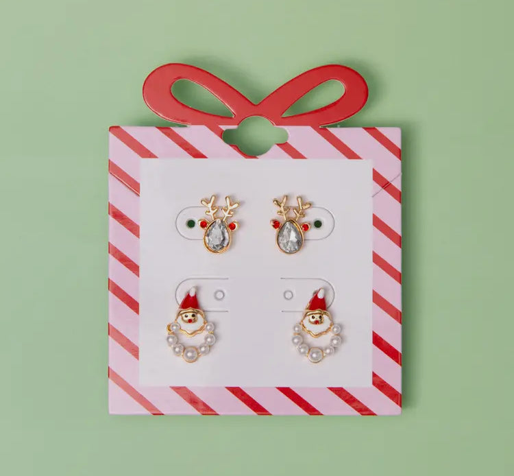 This festive earring set includes pearl-accented Santa studs and crystal-detailed reindeer designs, blending whimsical holiday charm with sparkling elegance. Crafted with gleaming finishes and artisan-style detailing, each pair is lightweight and comfortable with secure post backings for reliable day-to-night wear. The combination of playful character and radiant shine makes this set a joyful addition to any holiday jewelry collection.