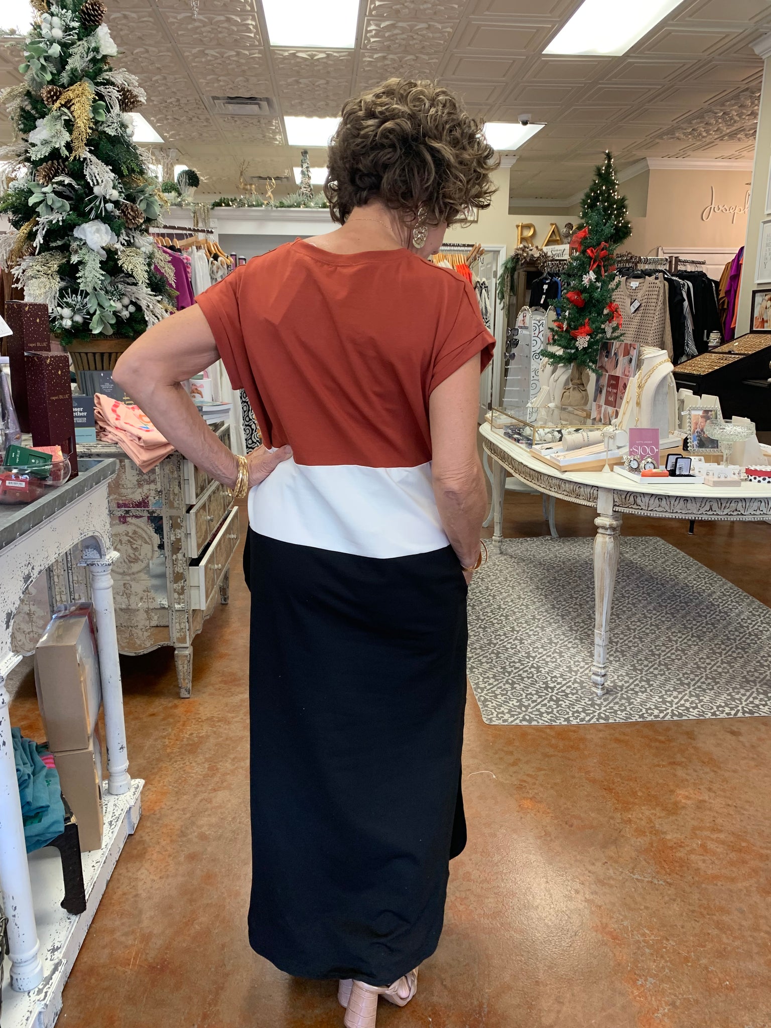 The Fun Feeling color block dress is a French terry casual maxi dress featuring a round neckline, color block design, short sleeves, side pockets, and side slits on both sides.