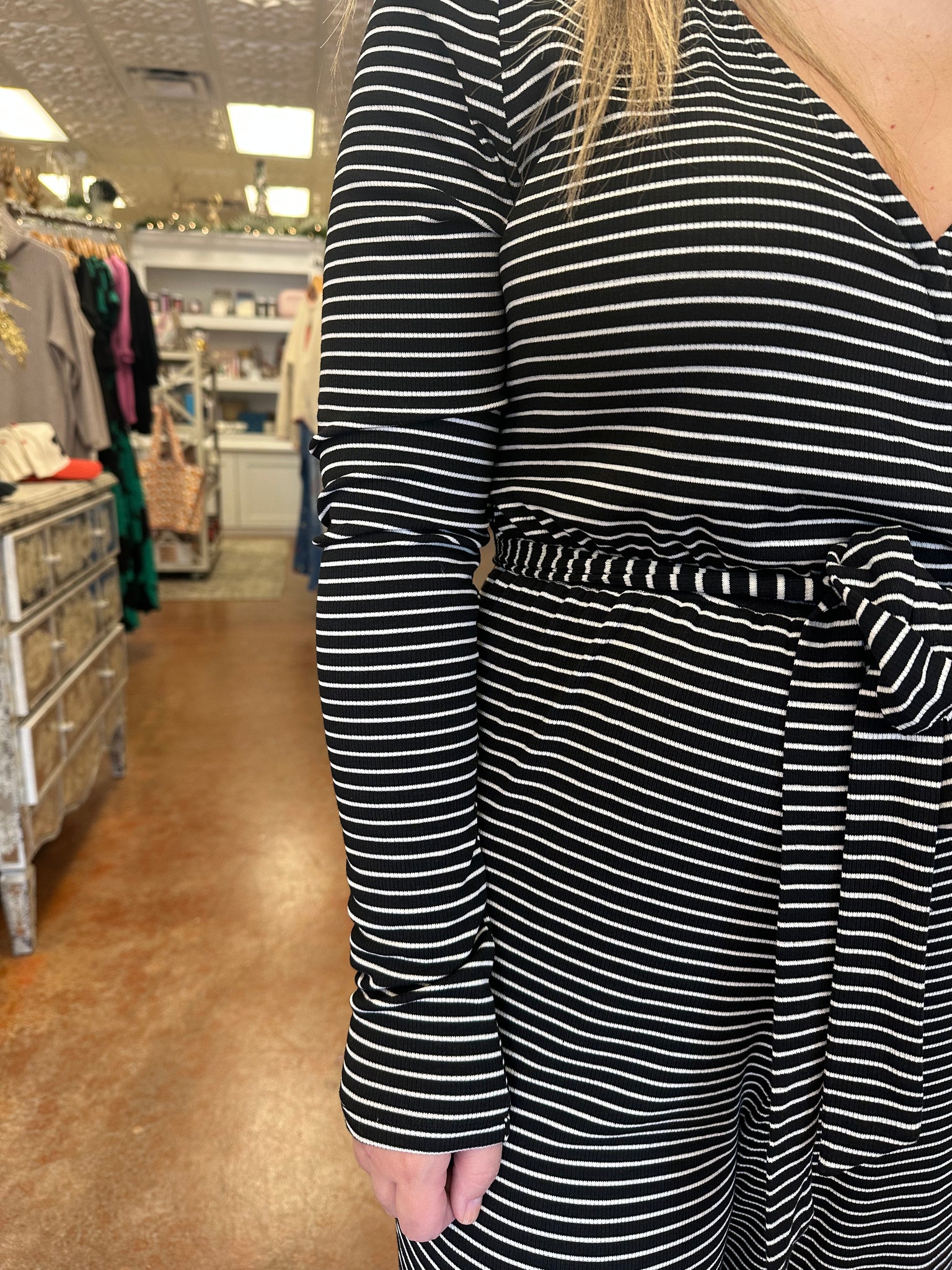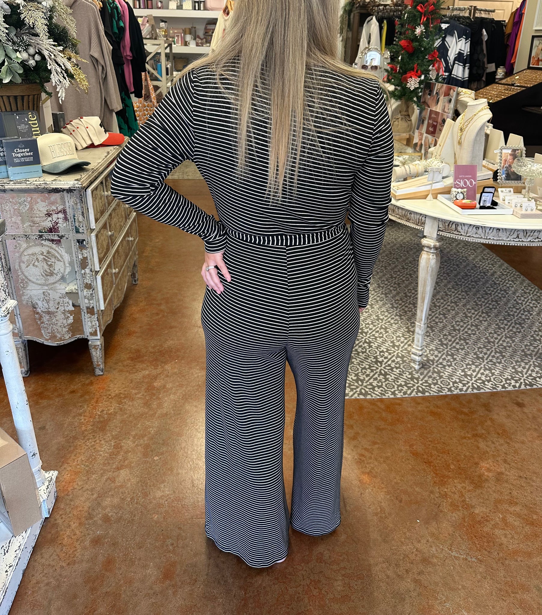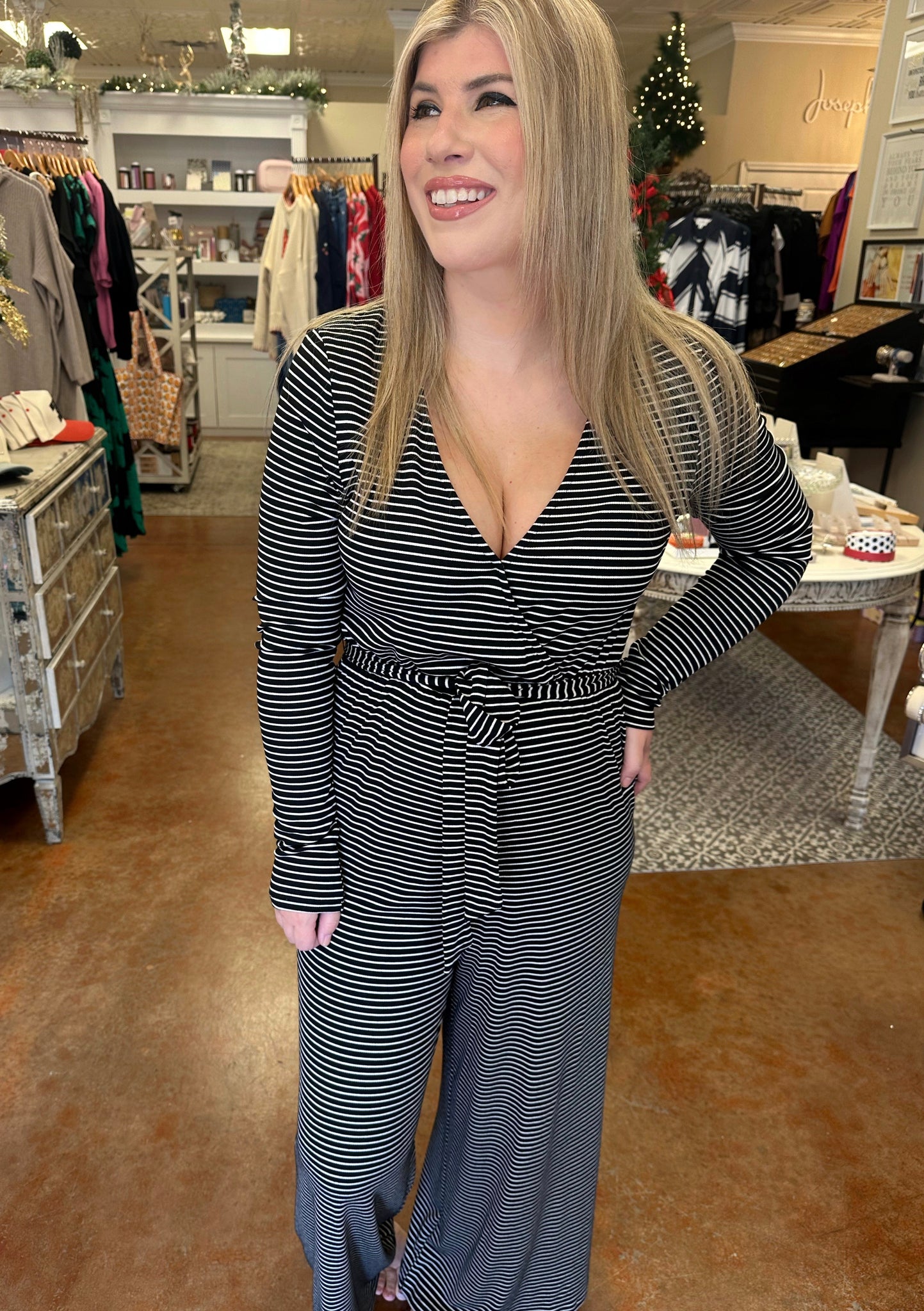 An elastic waist jumpsuit with long sleeves, tie belt. Relaxed fit, wide legs.