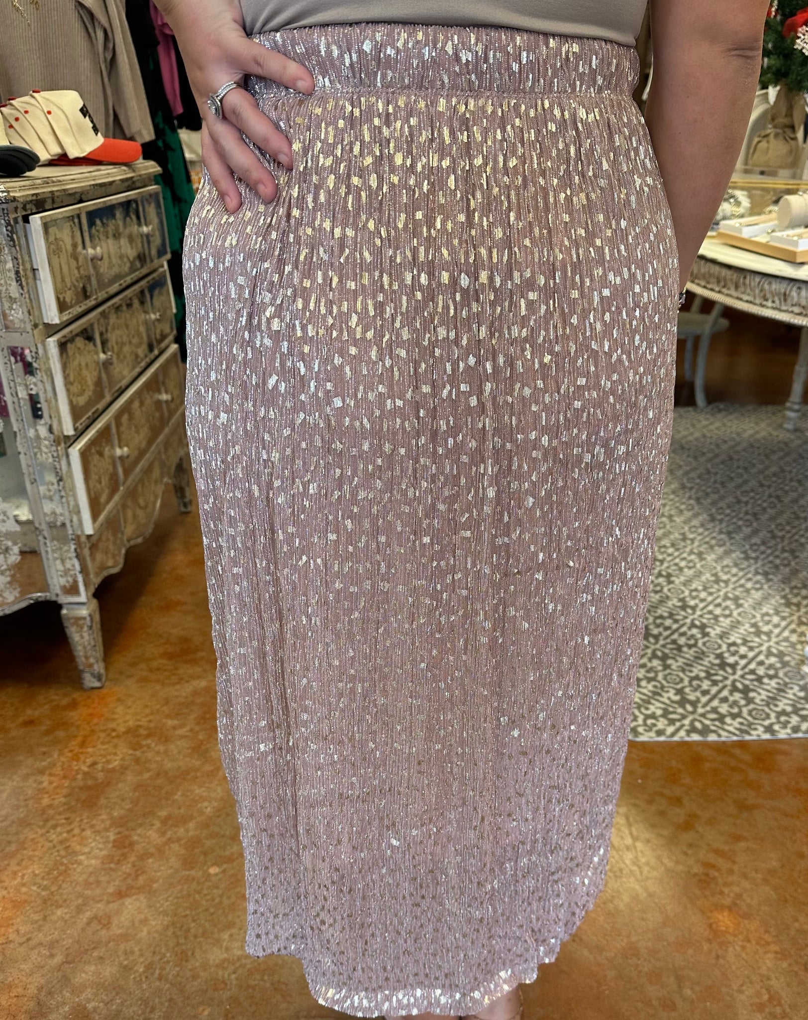 A metallic glitter midi skirt with elastic waist, knee length lining. Pleated mesh fabric.