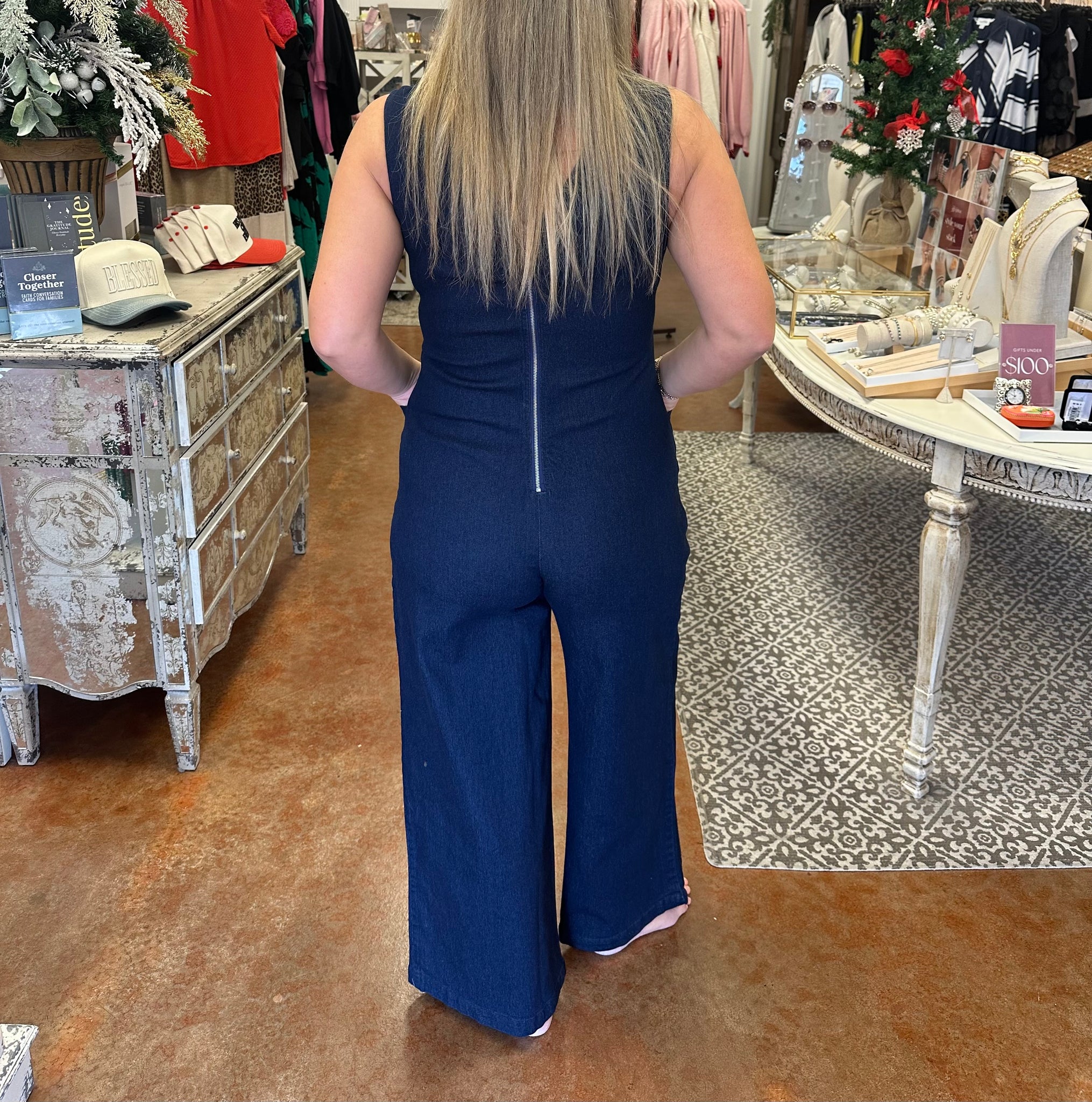 A stretch denim jumpsuit with v-neckline and front patch pockets. Zipper at back.