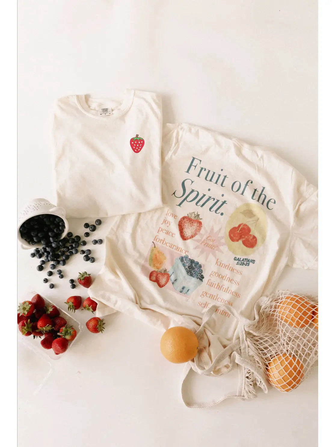 A summer best seller! 🍓 Growing + harvesting the goodness of the Fruit of the Spirit 🫐🍒 Printed on an off-white 100% Comfort Color tee. • Front: Strawberry patch in left corner • Back: graphic across the back