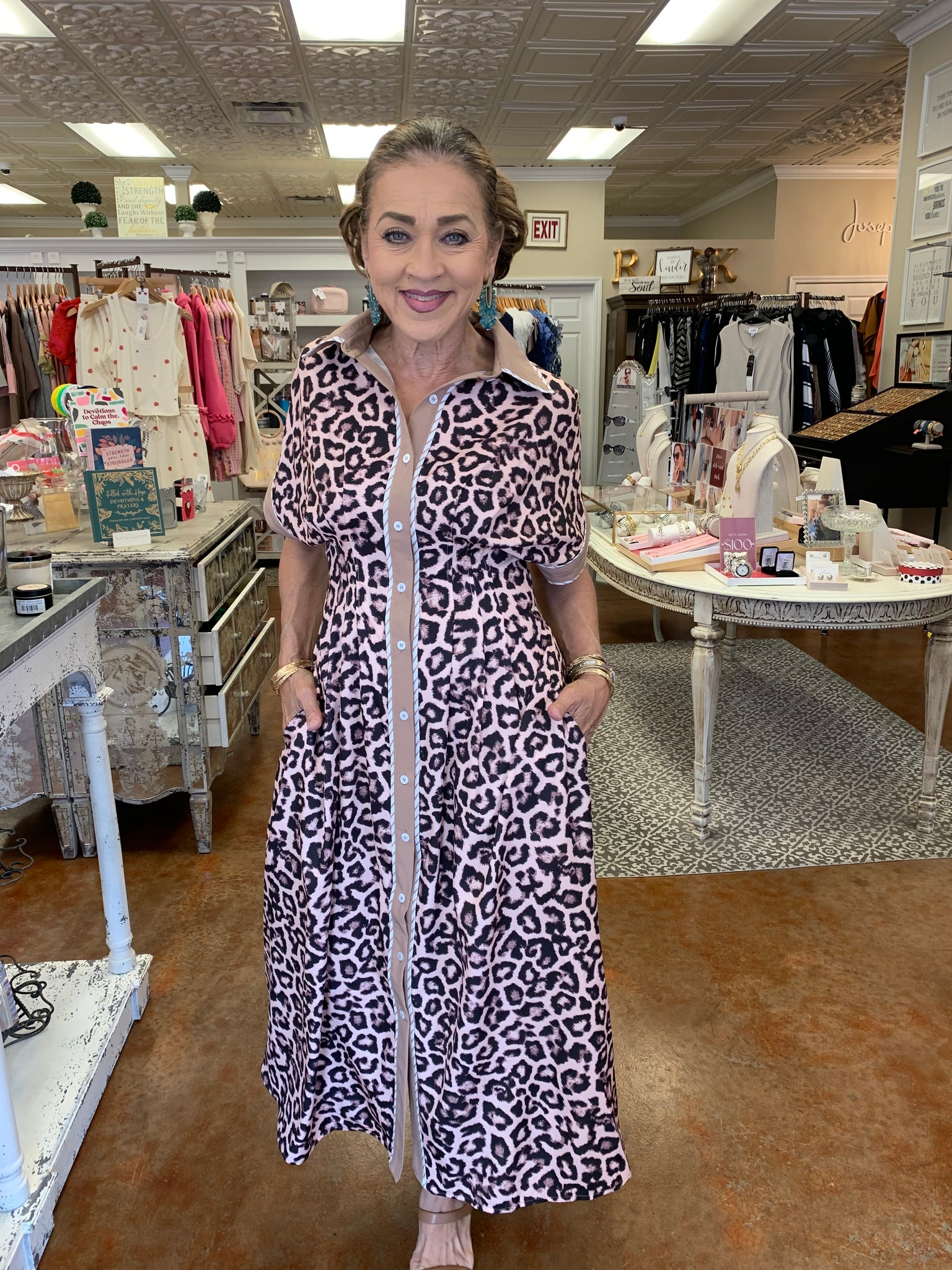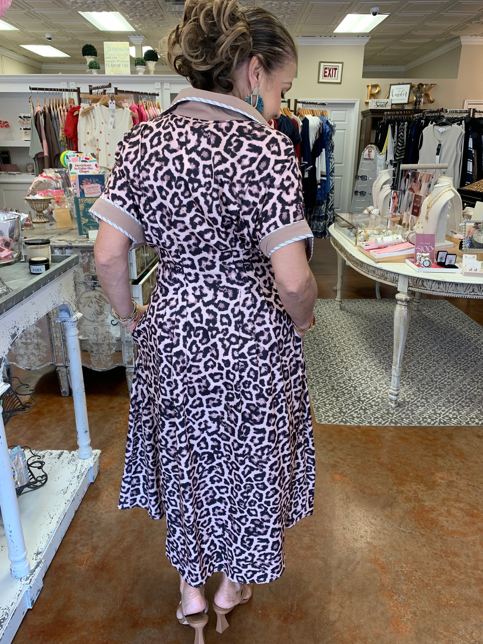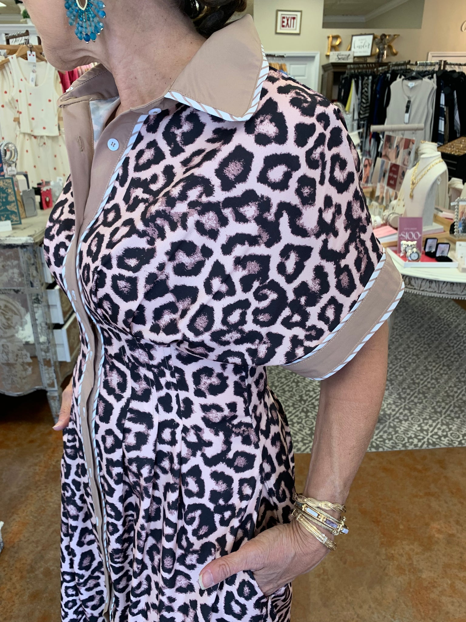 Leopard midi dress featuring lapel collar, button up front placket, dolman sleeves, pleated waistline and striped contrast detail.