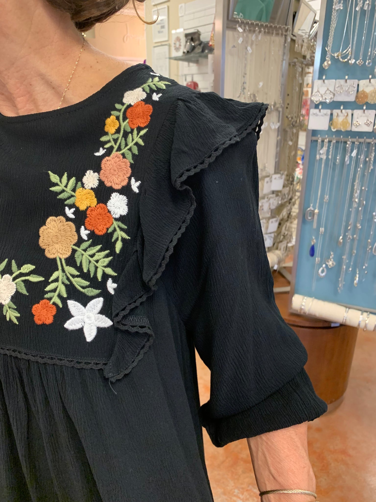 Gorgeous floral embroidery ruffle shoulder blouse! Features lace trim, multicolor floral embroidery, and elasticated sleeve opening.