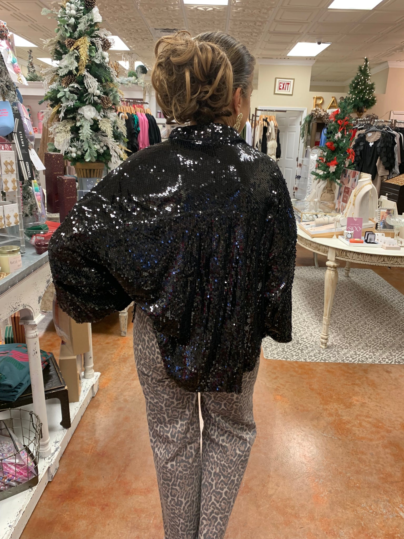A beautiful long sleeve sequin button down top with button detail cuffs. Perfect for a night out!