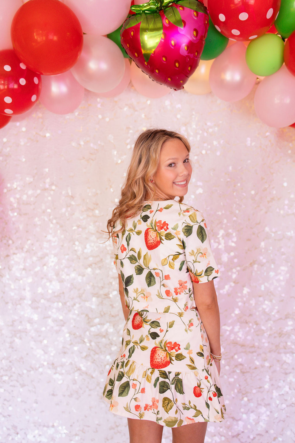 A cropped short-sleeve top featuring a vibrant strawberry and floral print. Designed with a rounded neckline, button placket at front.