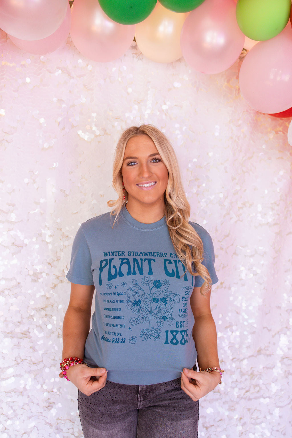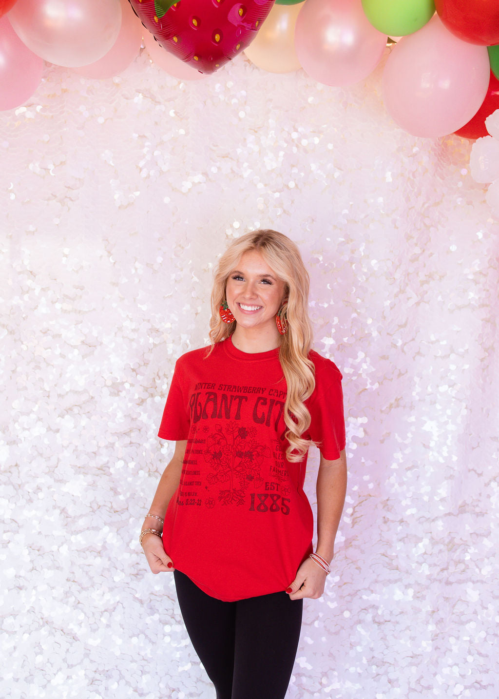 A Comfort Color tee featuring short sleeves and a crew neck with best selling, retro inspired design- WINTER STRAWBERRY CAPITAL BAND TEE. 2026 relaunch includes two new color options: red + ice blue.